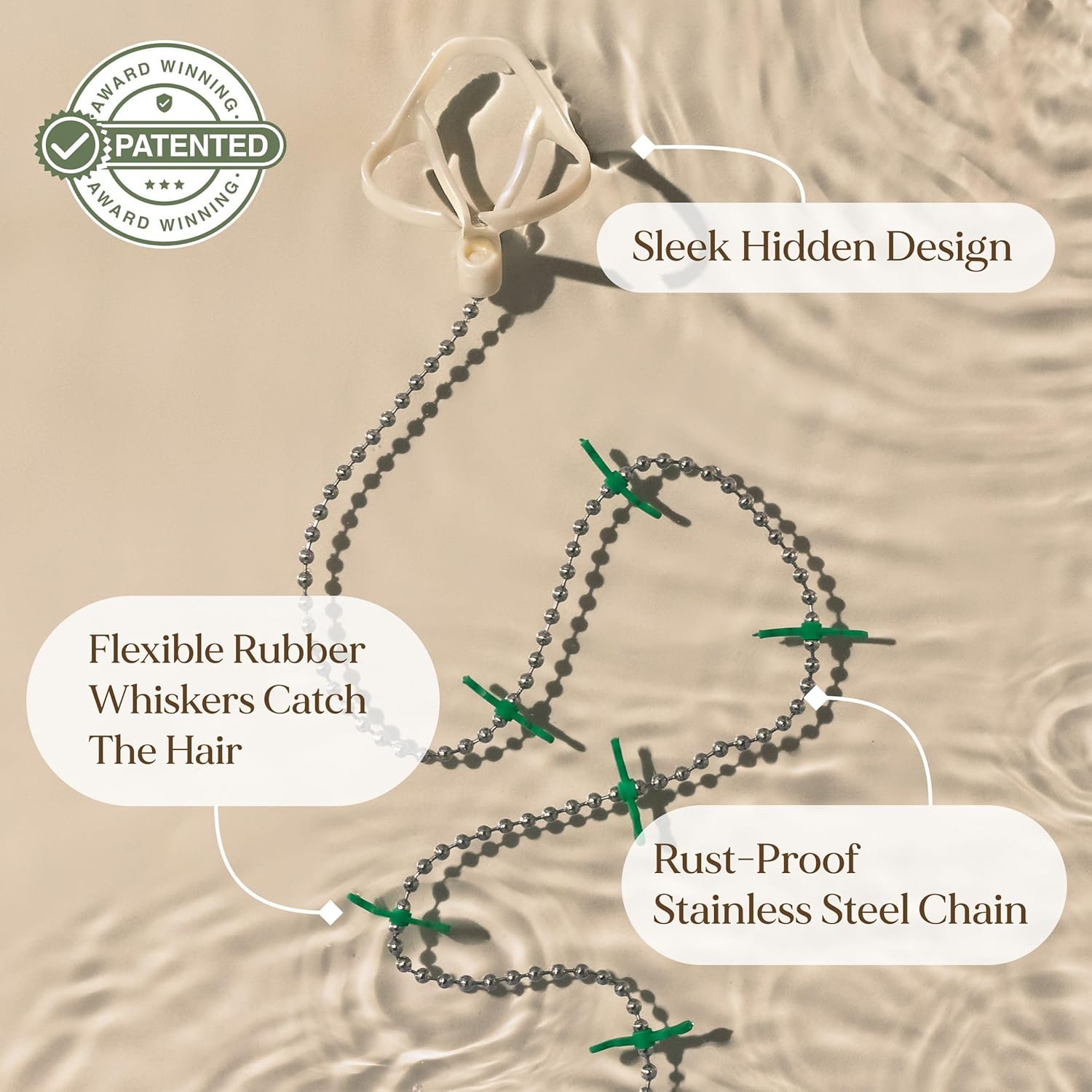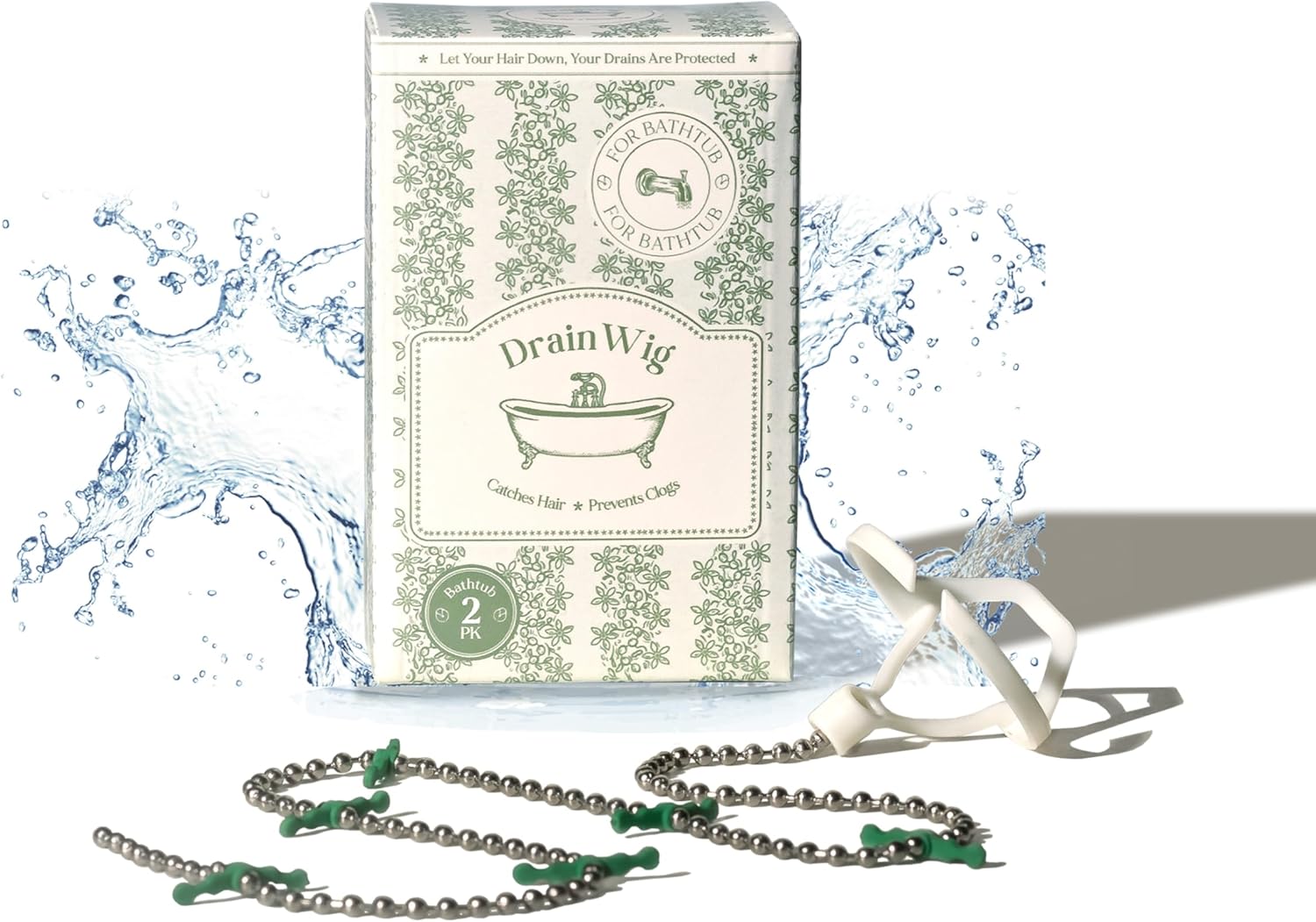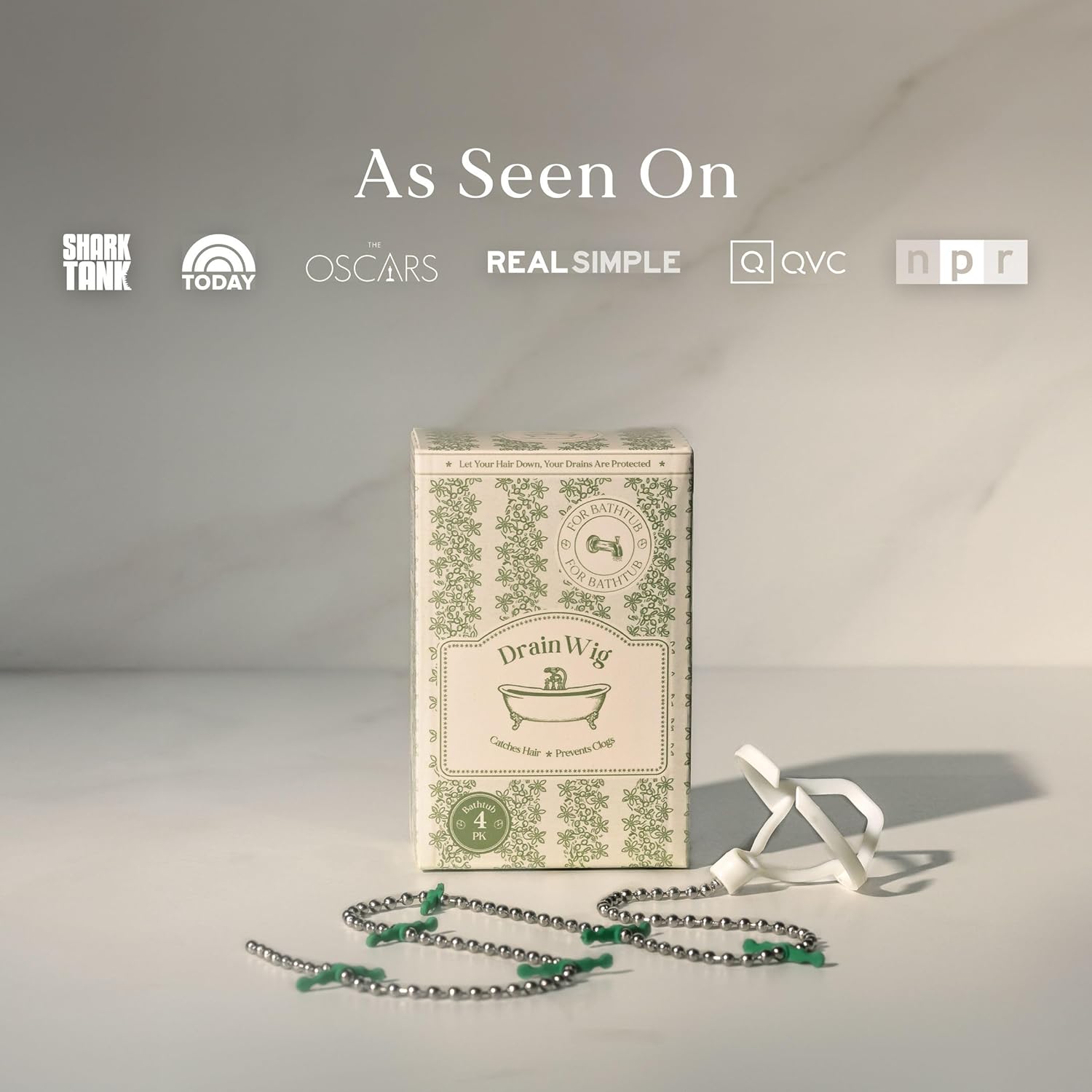 - Bathtub Drain Hair Catcher – DrainWig’s revolutionary patented design drops a chain beneath your stopper to catch hair inside the drain before it clogs. Simply toss and replace every 2–4 months—no need to touch wet, tangled messes by hand. AS SEEN ON SHARK TANK