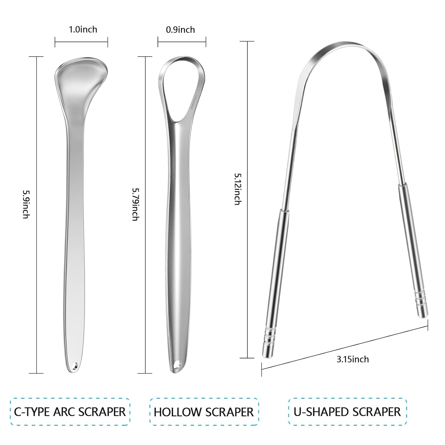 - Metal Tongue Scrapper Set: Come with 4 Pcs tongue cleaners scrapers, 2 Pcs u shaped, 1 Pcs hollow scraper, 1 Pcs spoon scraper. Different shaped and sizes meet your diversified needs, suitable for adults and kids. Well packed in a carrying box for storage, keep it clean and dust-proof