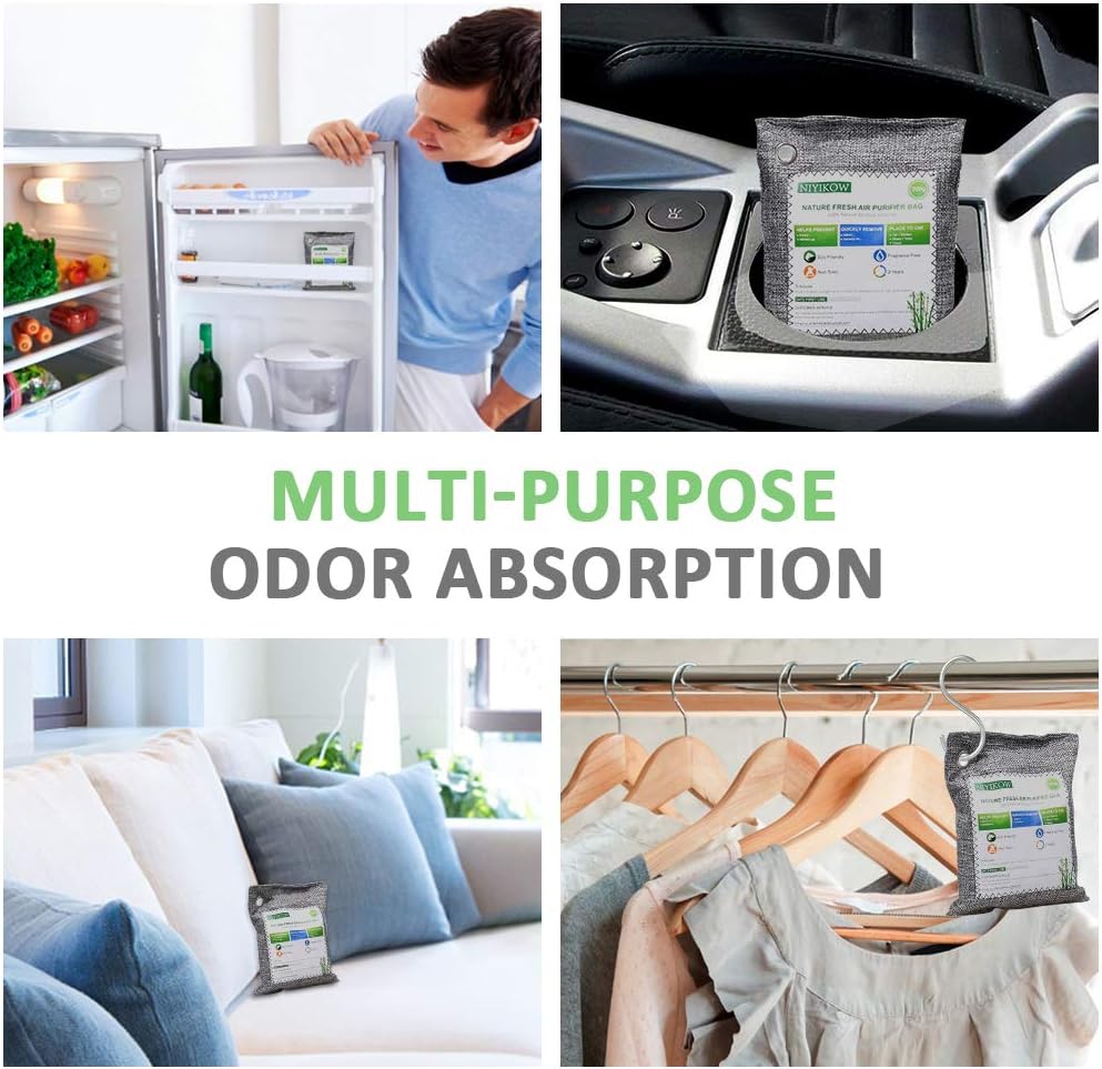 - All-Natual Ingredient Odor Absorbe - Our charcoal air purifying bags use the highest quality bamboo charcoal from Southeast Asia — with NO harmful additives. 10 times better than regular charcoal as each natural air purifier bag contains activated charcoal from sustainable bamboo processed with high temperature oxygen-free carbonization. These bamboo bags are the best choice for clean air and odor removal.
