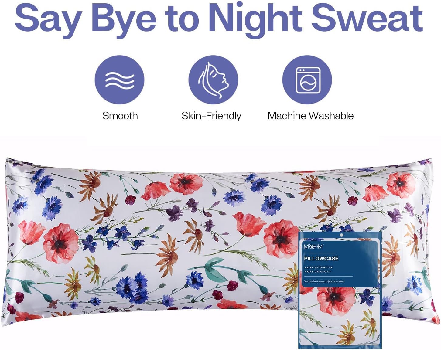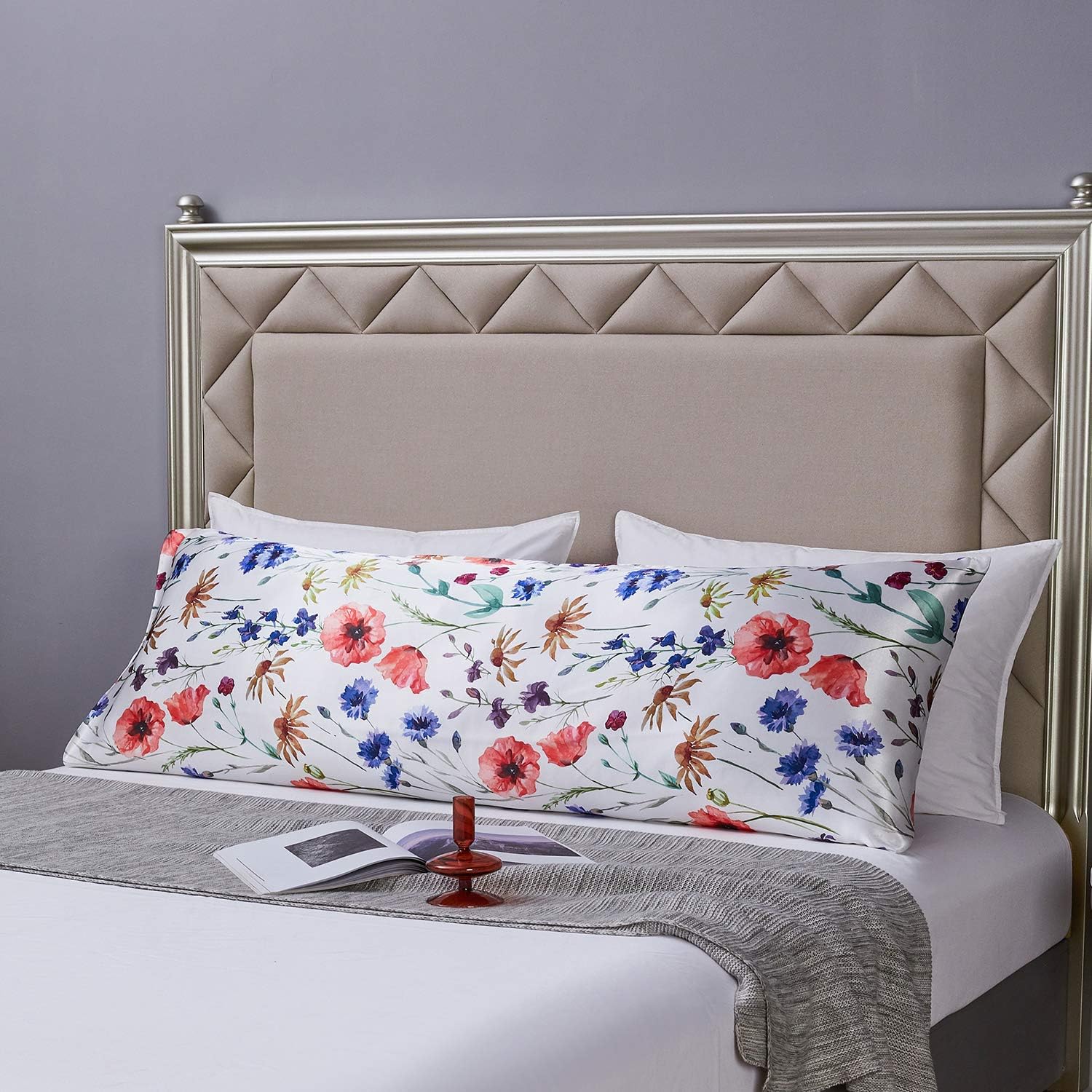 MR&HM Satin Body Pillow Cover, Soft and Breathable Body Pillow Case with Envelope Closure, Cooling and Silky Long Pillowcase for Hair and Skin,Grey (20x54, Floral Mixted)