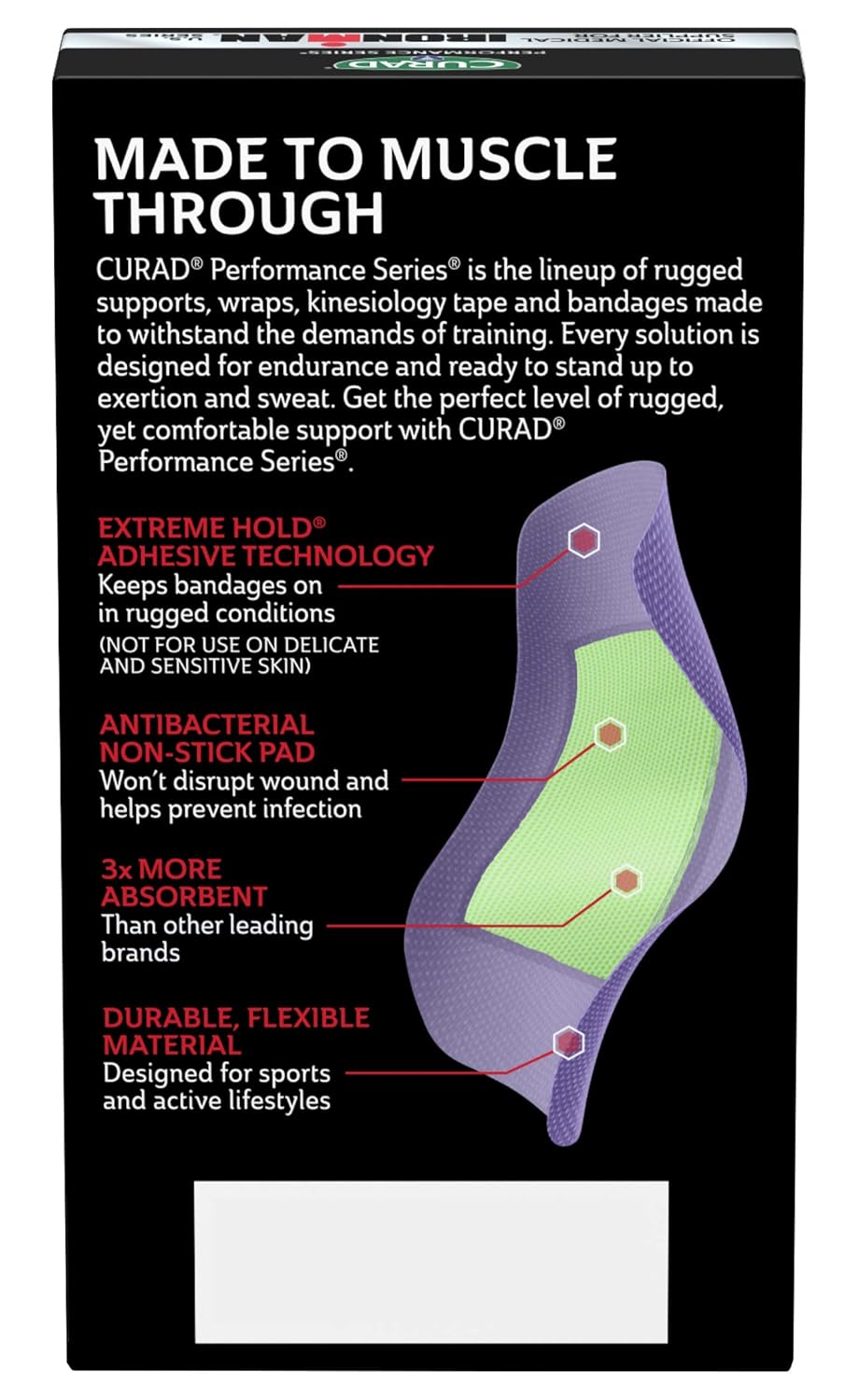 CURAD Performance Series IRONMAN Antibacterial Bandages, Extreme Hold Adhesive Technology, Extra Large Flexible Fabric Bandages for Cuts, Scrapes, & Burns, Assorted Colors, 2 x 4 inches, 10 Count