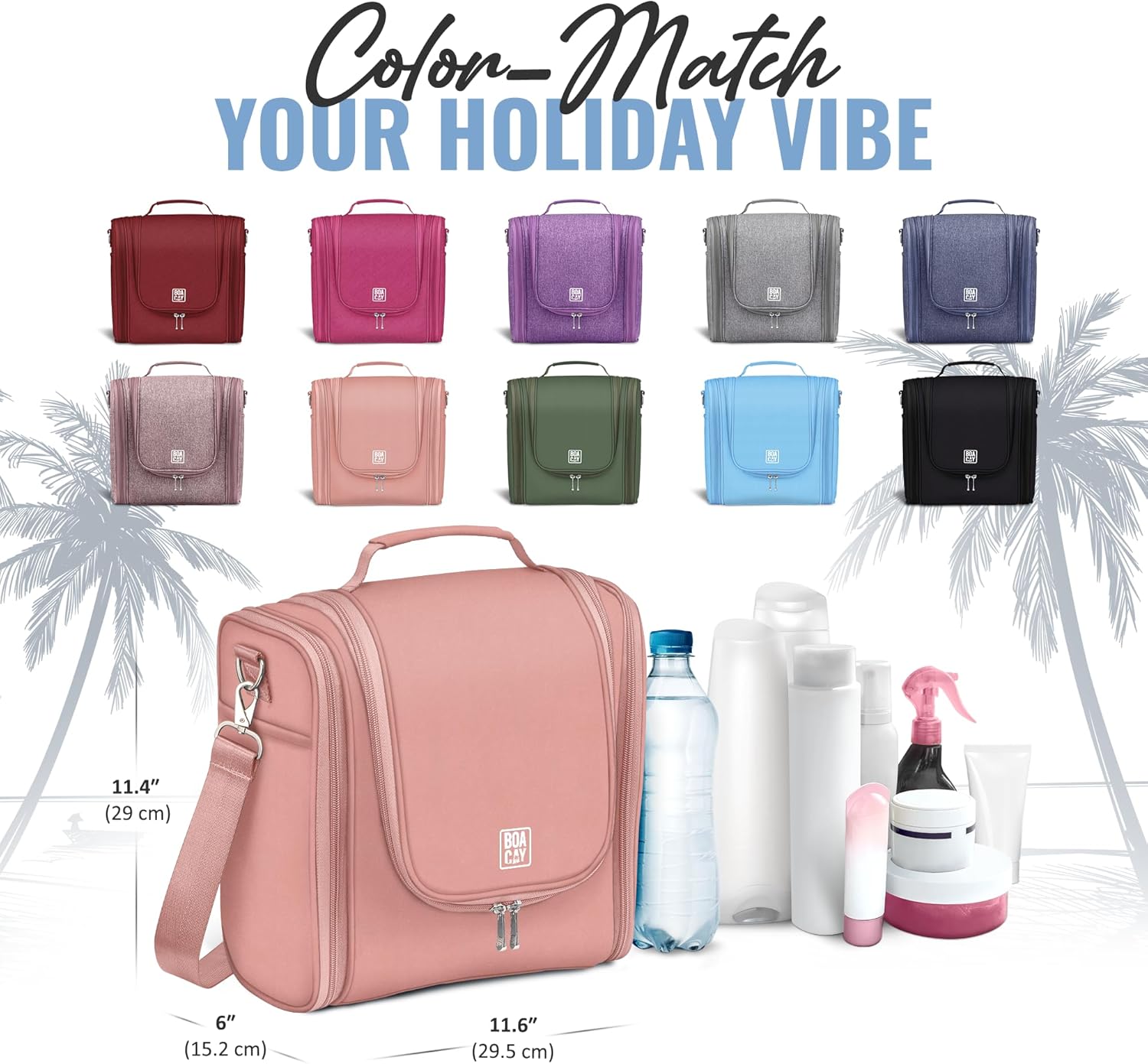 - If you want a large makeup bag, a cosmetic, or an accessories organizer, Boacay toiletry bag is for you. It is multifunctional, has metal zipper pulls, and it’s made of only high-quality materials.