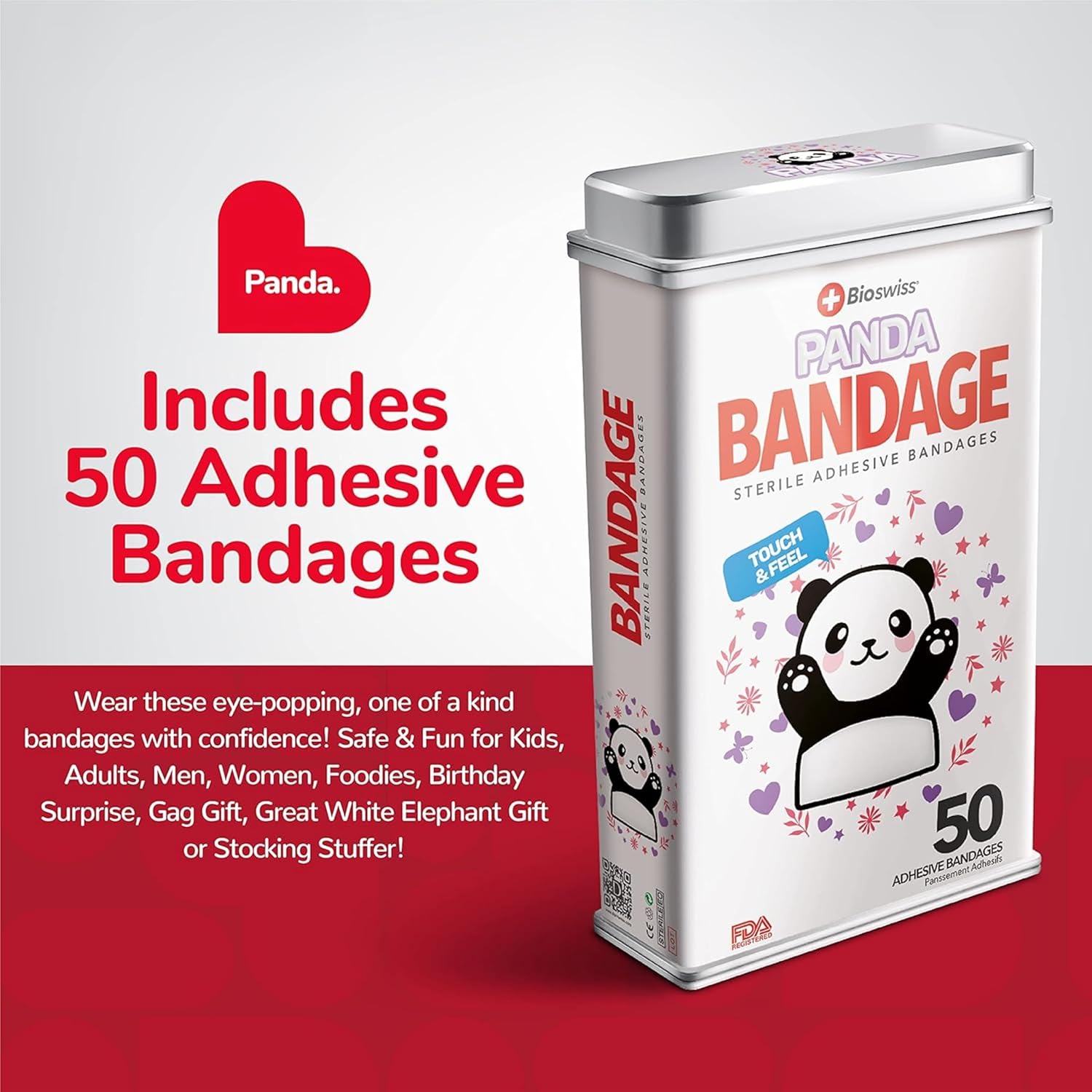 - 50 PANDA KIDS BANDAGES: Fun panda bear-shaped adhesive bandages tin helps protect cuts, scrapes, and minor wounds while making healing less stressful for children