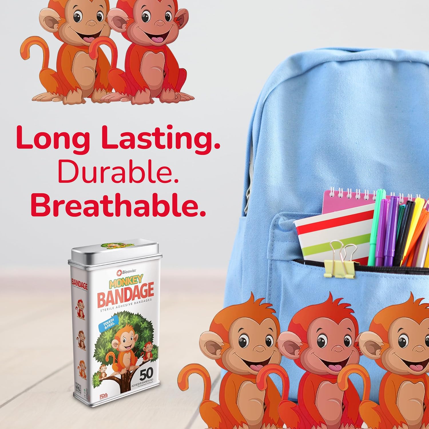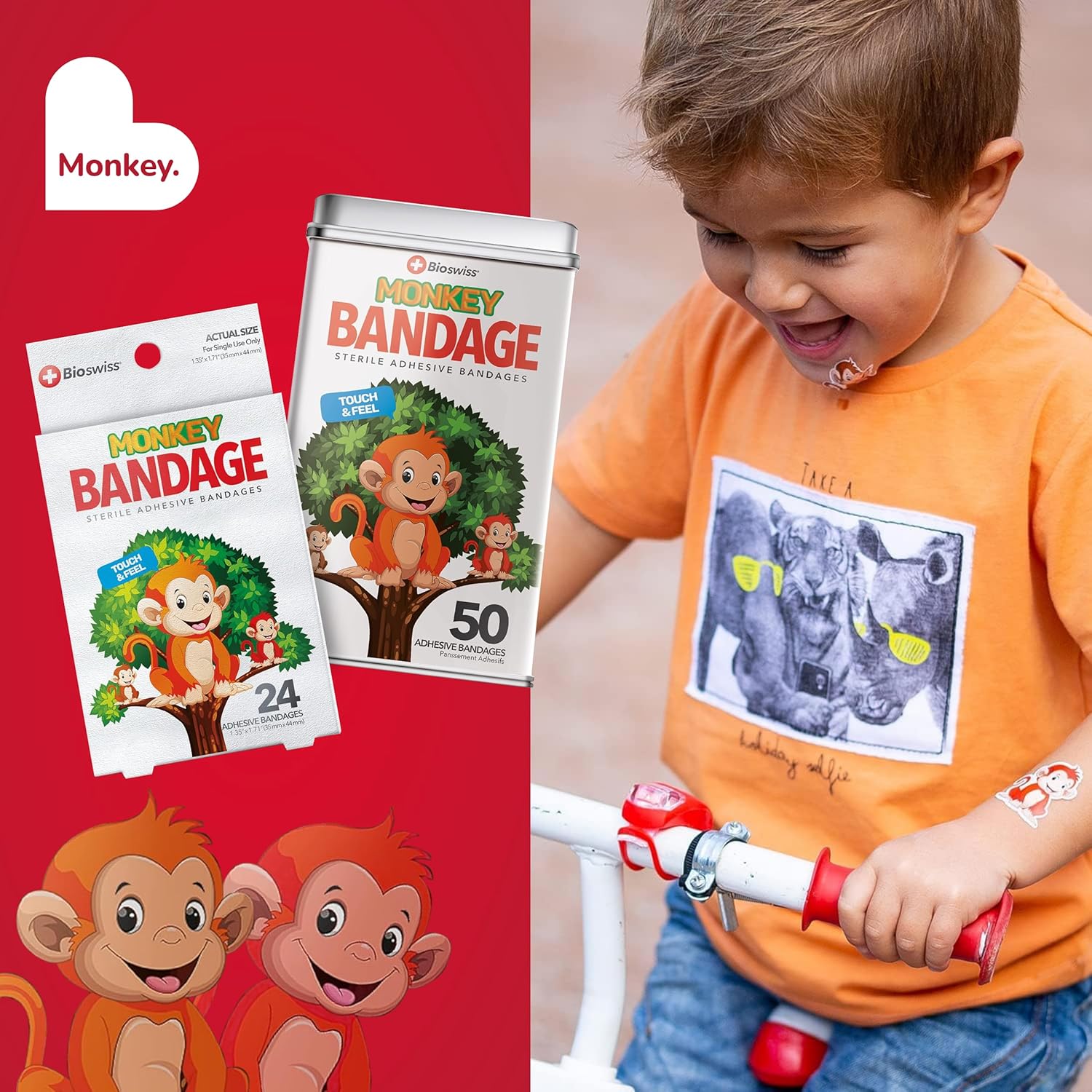 - 50 MONKEY KIDS BANDAGES: Fun monkey-shaped adhesive bandages tin helps protect cuts, scrapes, and minor wounds while making healing less stressful for children; bandages come in 3 assorted styles