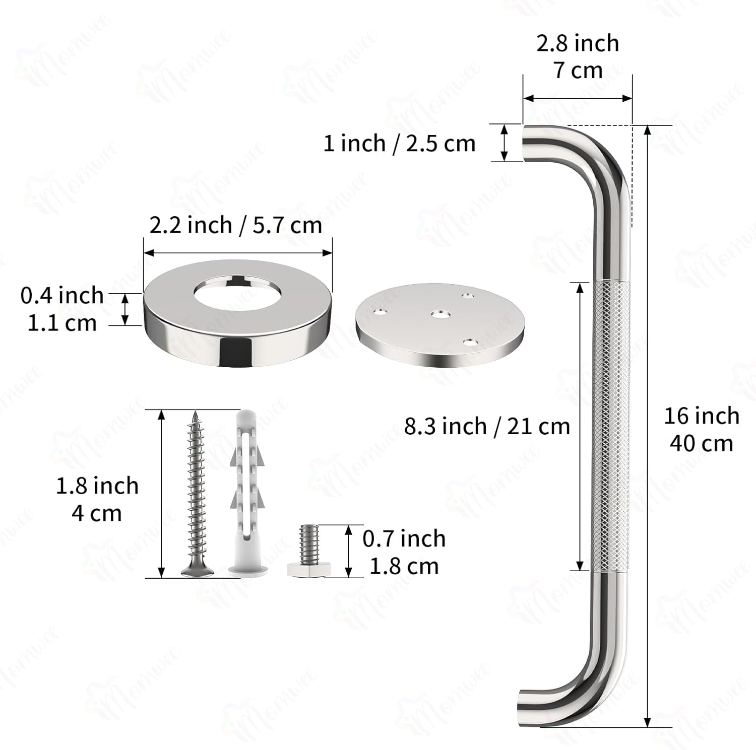 - iMomwee 16 inch chrome finished anti-slip shower grab bars with 1.25 inch diameter; Equipped with mounting screws and anchors for easy to install. Can be easily and safely installed at any angle.