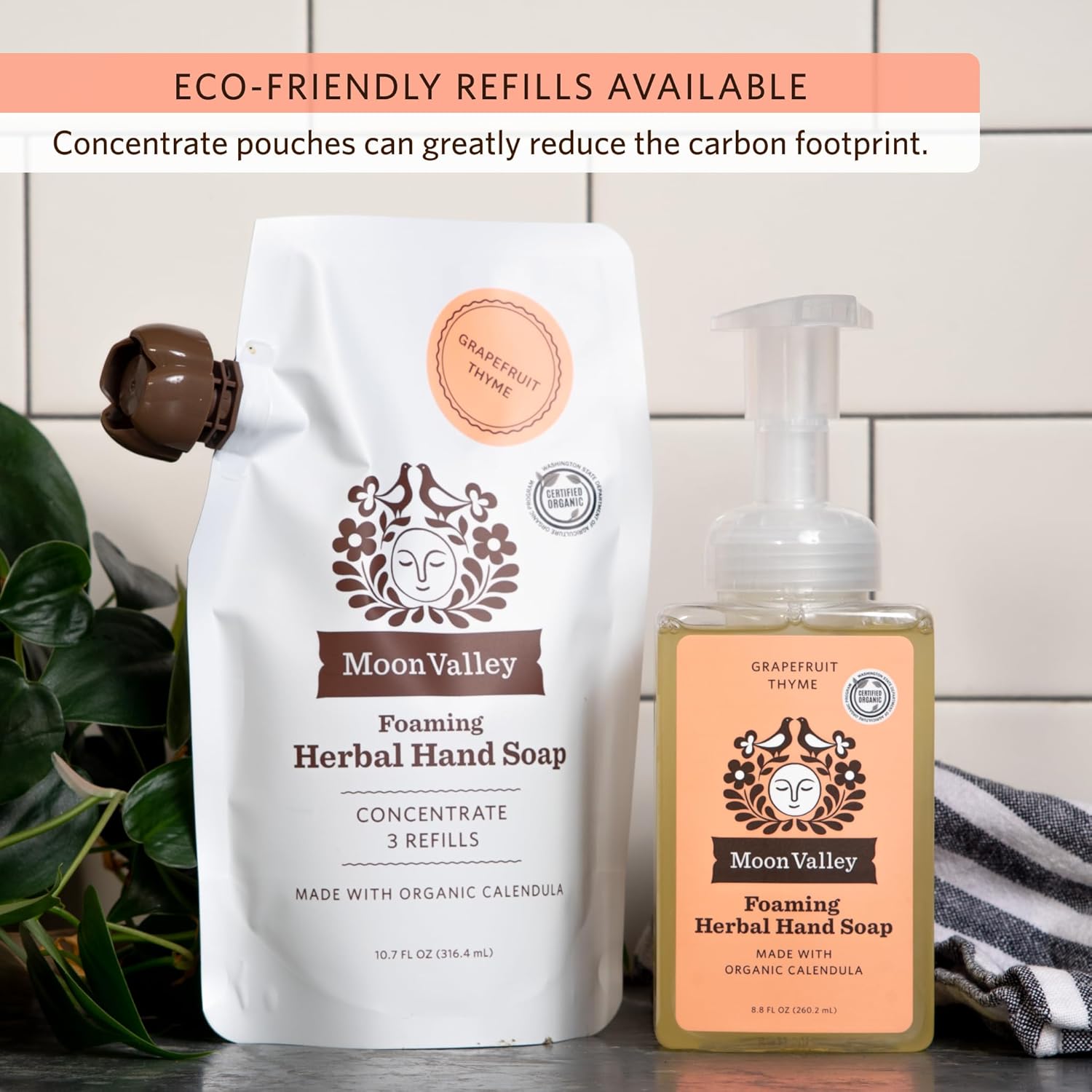 - TWO-PACK: This bundle of two 8.8oz Foaming Hand Soaps includes fresh and natural scents of Grapefruit Thyme. Moon Valley Herbal Foaming Hand Soaps are certified organic, vegan and non-gmo. Each bottle is recyclable. Ingredients leave hands soft and moisturized.