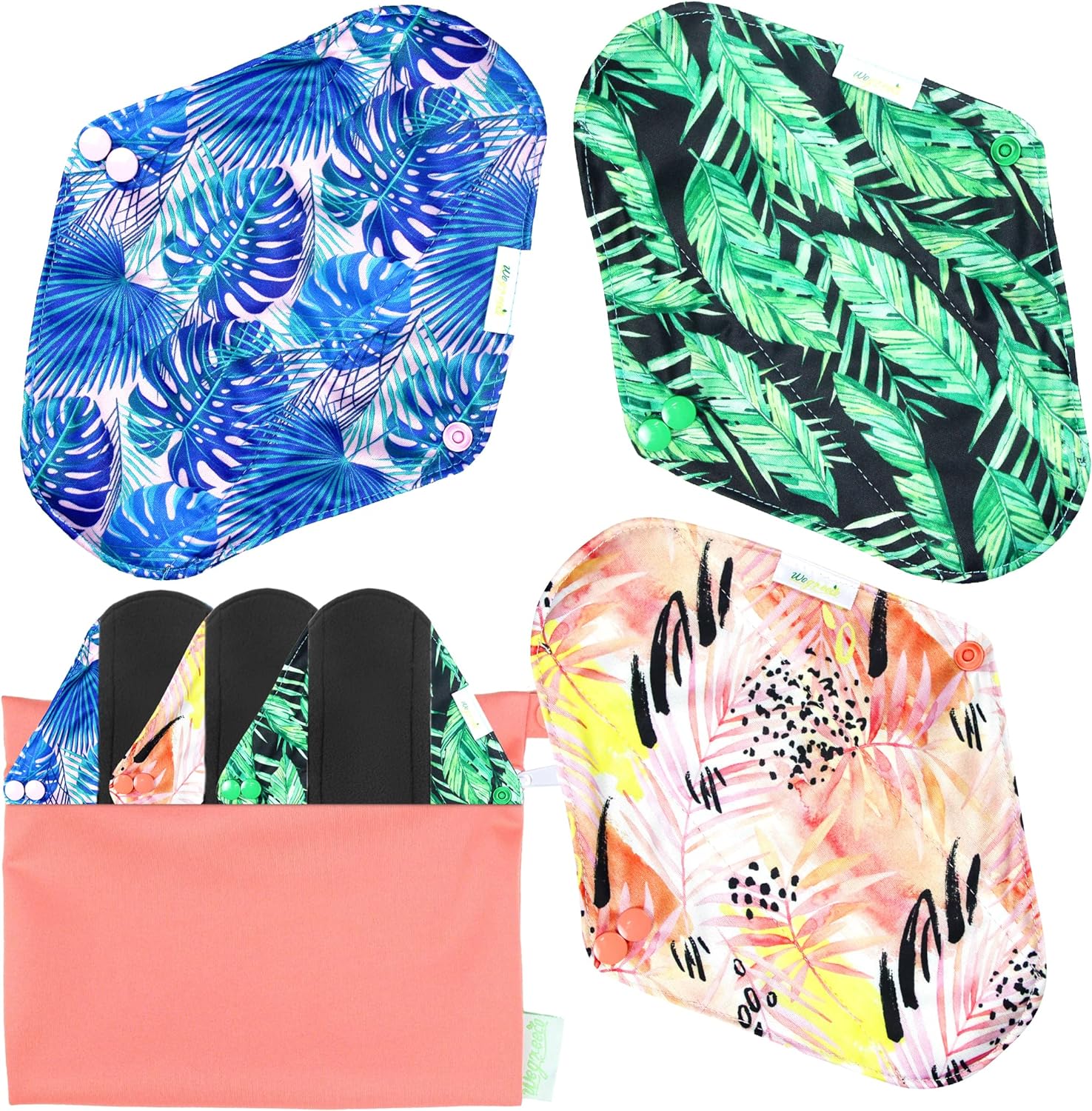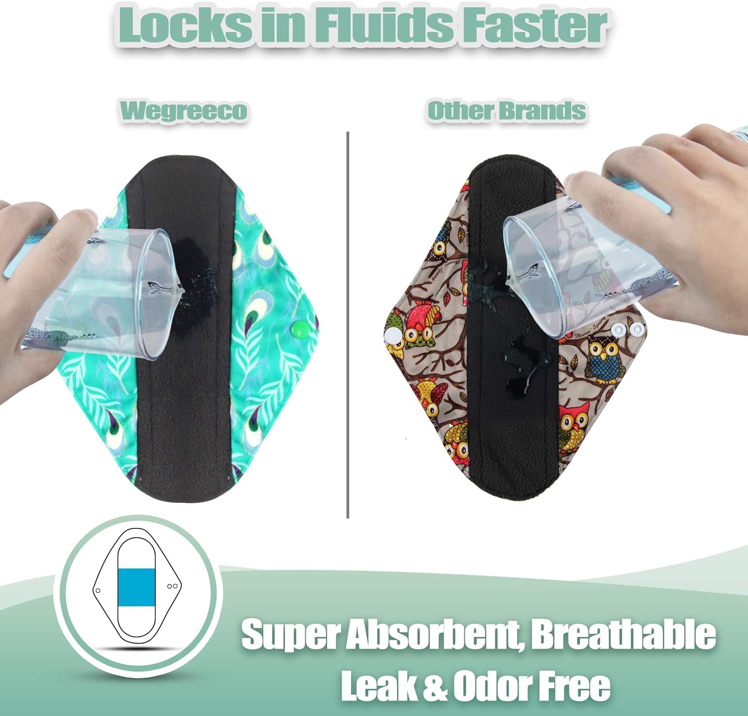 wegreeco Charcoal Reusable Menstrual Pads - Reusable Sanitary Pads | Reusable Panty Liners | Soft Cloth Menstrual Pads - 6 Pack with 1 Cloth Mini Wet Bag (Small, Leaves)