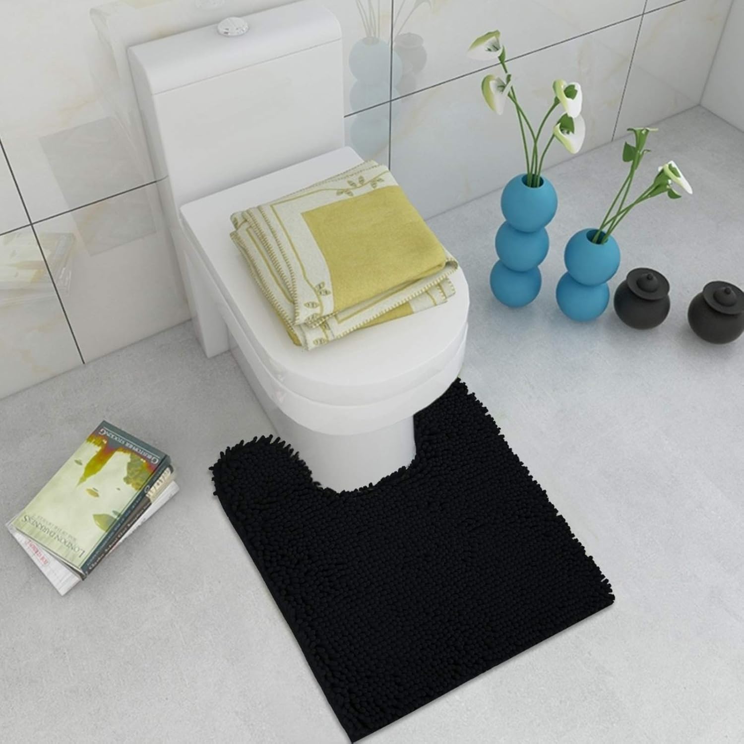 ITSOFT Non-Slip Shaggy Chenille Toilet Contour Bathroom Rug with Water Absorbent, 24 x 21 Inches U-Shaped Black