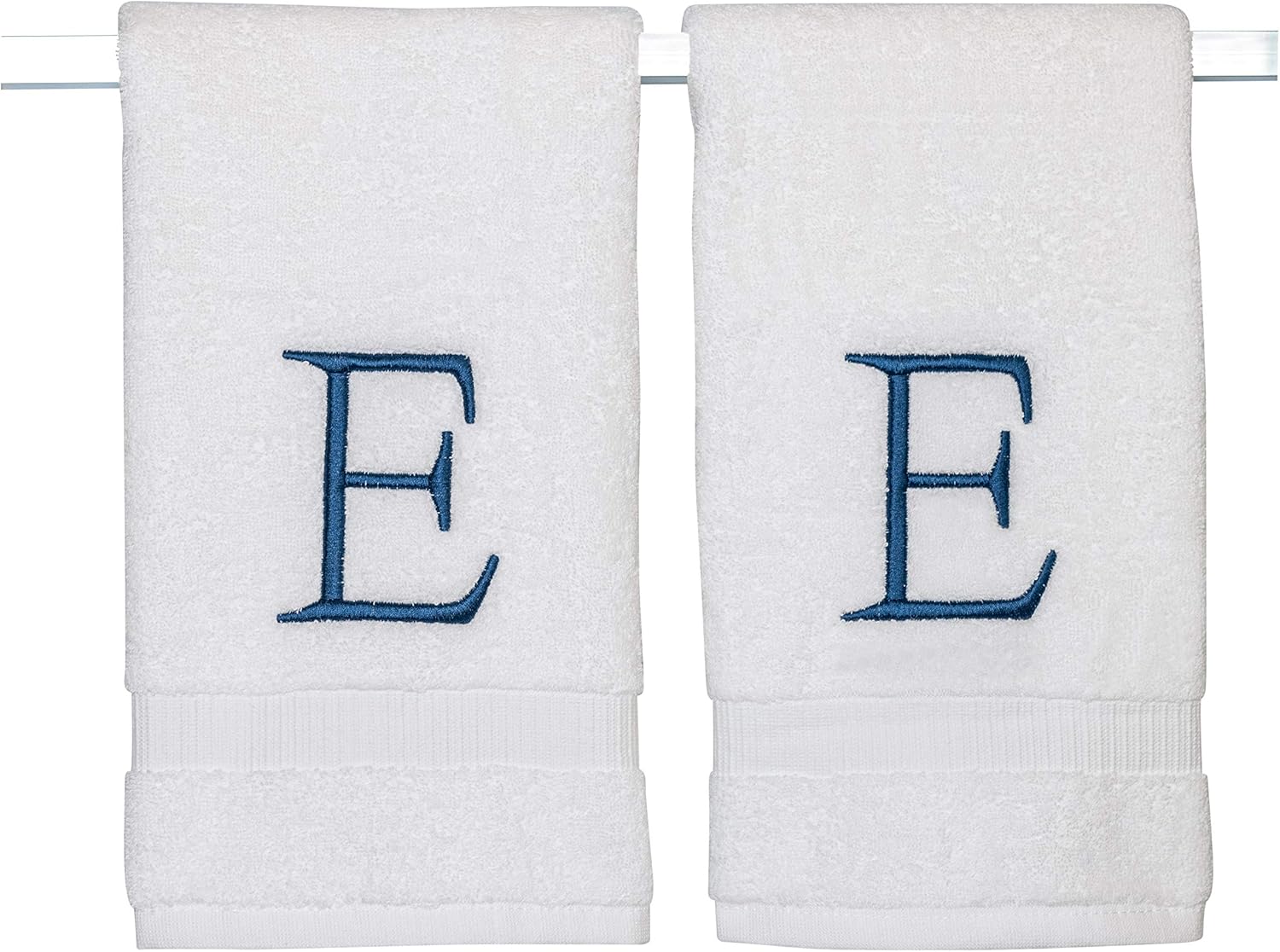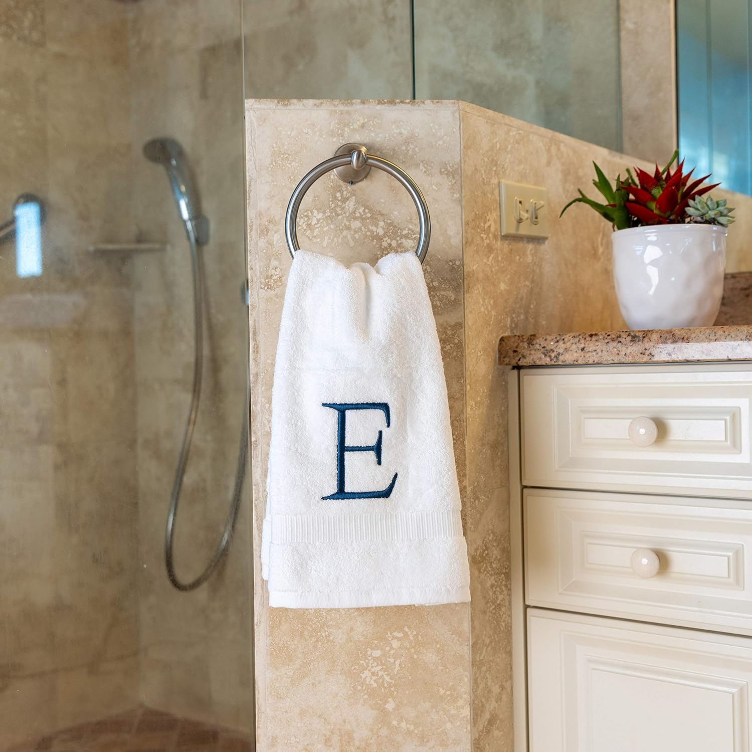 Monogrammed Hand Towels for Bathroom - Luxury Hotel Quality Personalized Initial Decorative Embroidered Bath Towel for Powder Room, Spa - GOTS Organic Certified - Set of 2 Navy Letter E