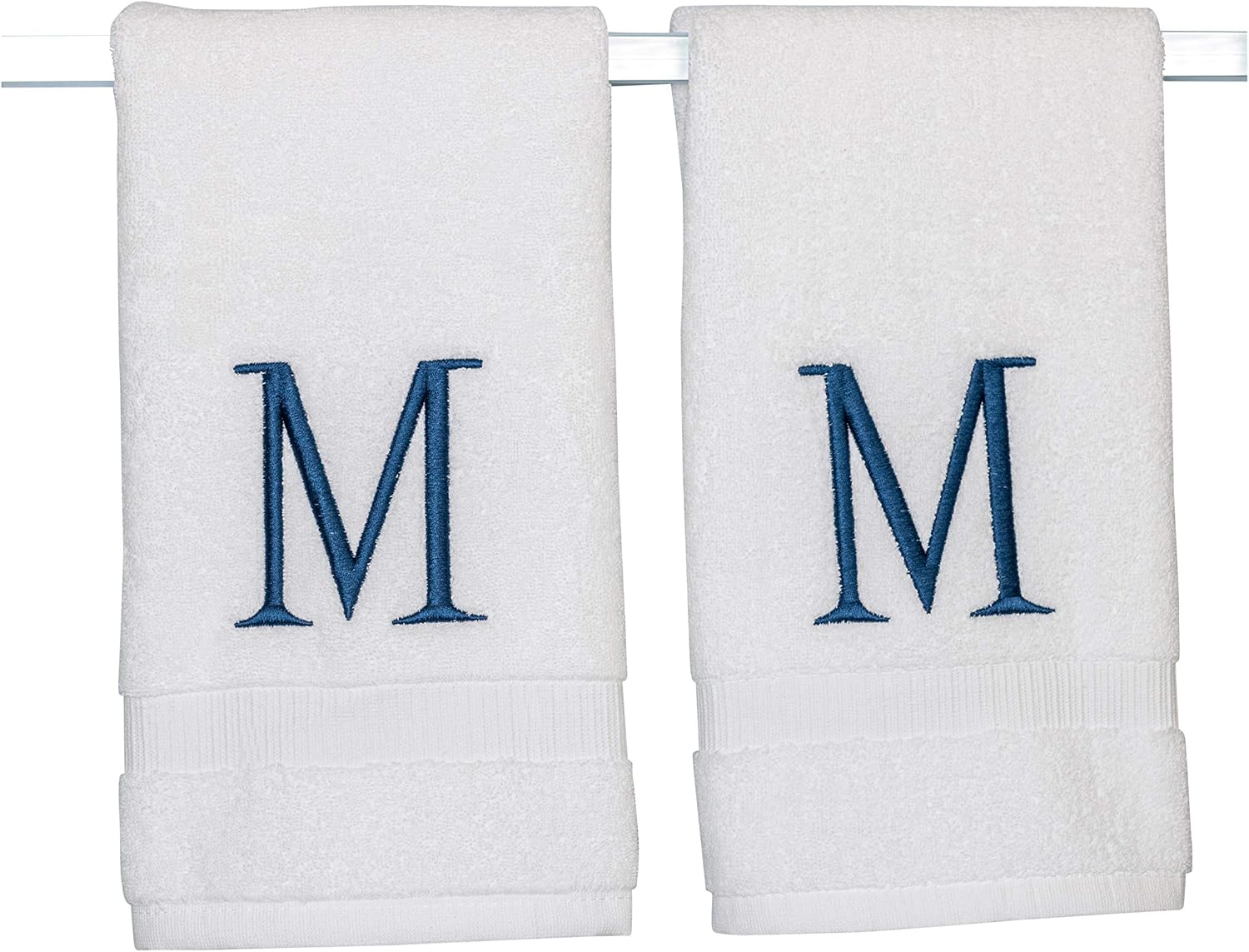 Monogrammed Hand Towels for Bathroom - Luxury Hotel Quality Personalized Initial Decorative Embroidered Bath Towel for Powder Room, Spa - GOTS Organic Certified - Set of 2 Navy Letter M