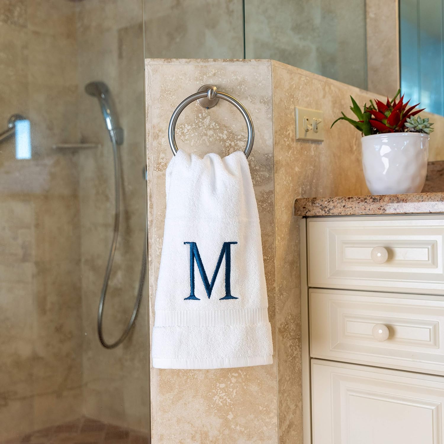 - Premium Quality - High quality durable soft rich monogram letter hand towels in white cotton with navy blue stitching