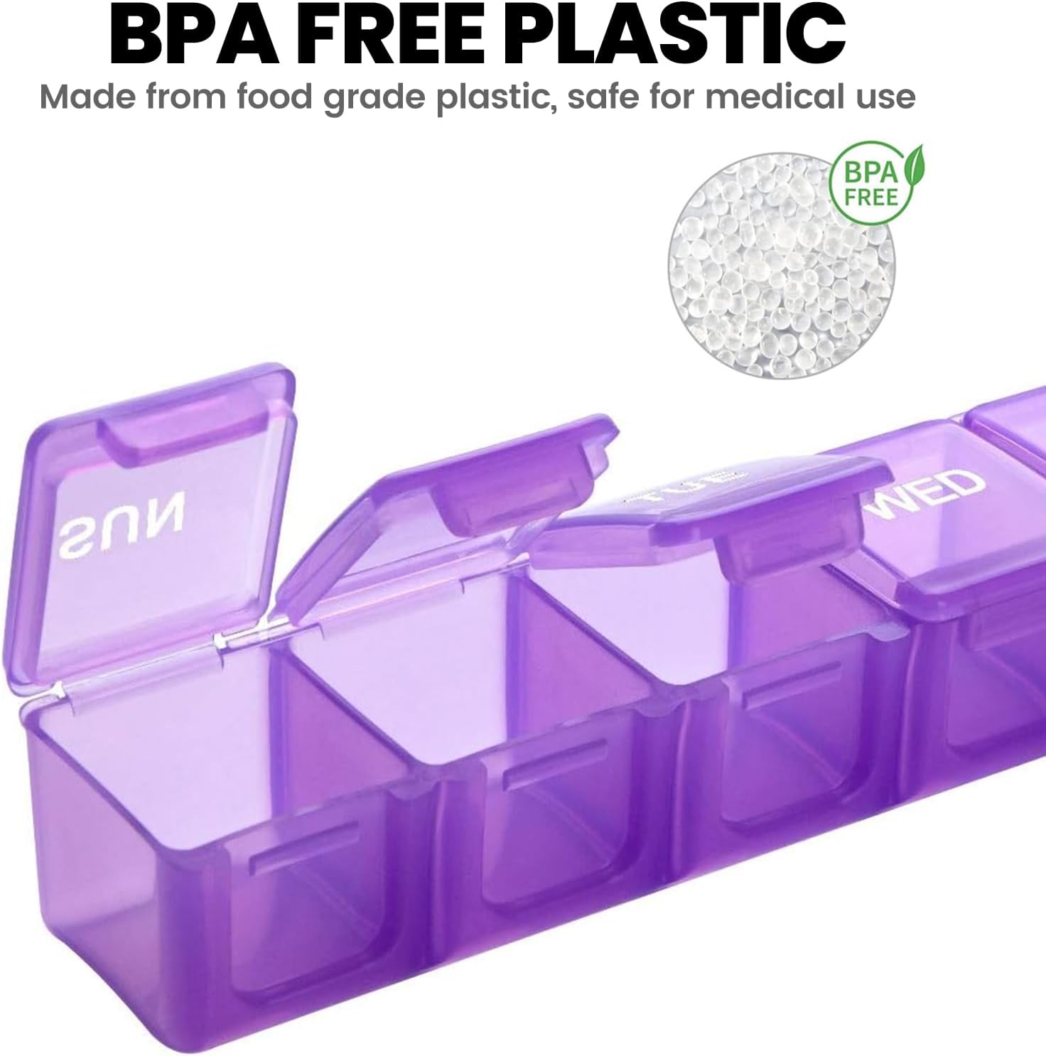 Sukuos Extra Large Weekly Pill Organizer, 7 Day Daily Pill Box Case Arthritis Friendly, Silkscreen Printed Medicine Container with Clear Lid for Vitamins, Fish Oils or Supplements (Purple)