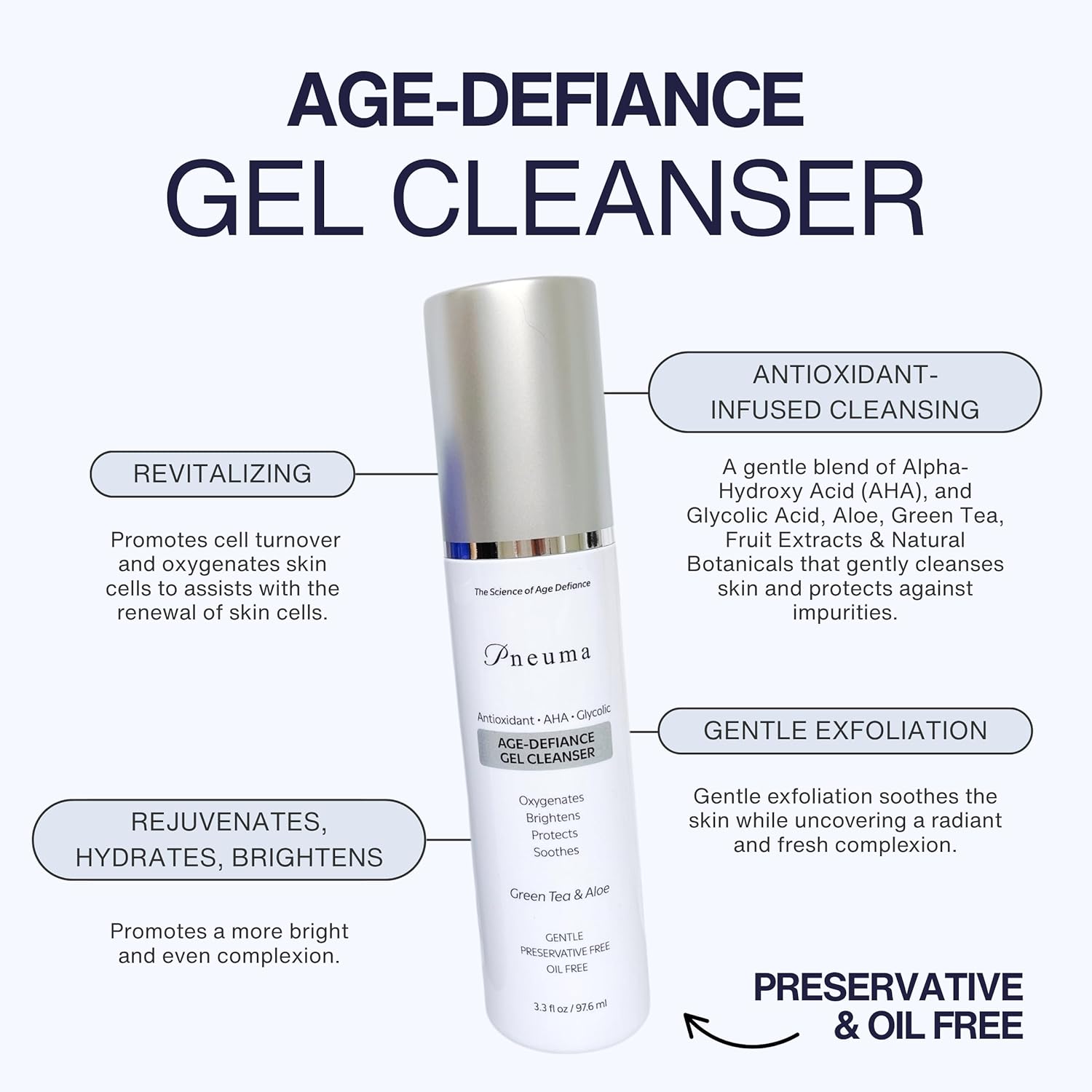 - BENEFITS: The Pneuma age defiance gel cleanser is a perfect cleanser which rejuvinates, hydrate, brightens, oxygenate, encourages cell turnover and soothes the skin. It is preservative & oil-free which allows the skin to breathe fresh and is gentle on your skin. It is a daily face wash of alpha-hydroxy acid.