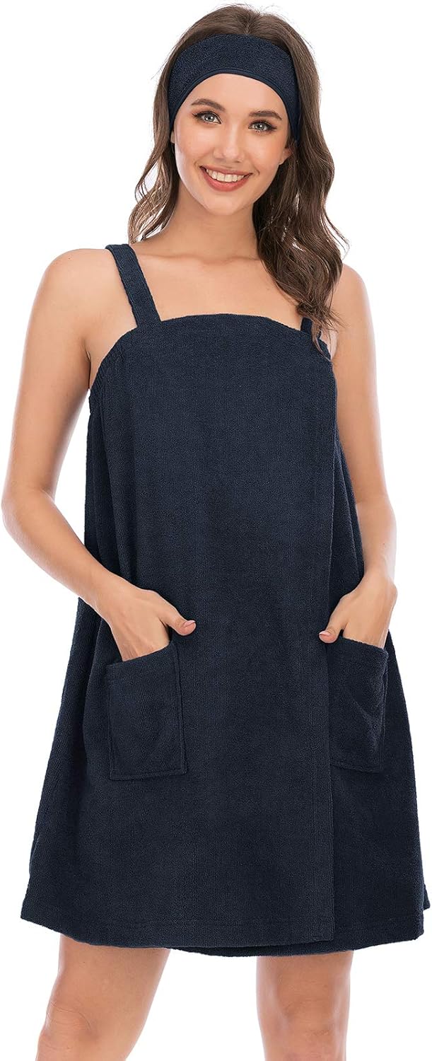 - ♦ VERSATILE: Our Bath Towel robe designed with two big pockets, convenient to hold phone, makeup and other belongings. The wrap matching with Facial Headband, when you facial care can hold your hair back to wash face or stop liquid from dripping into eyes and on face.