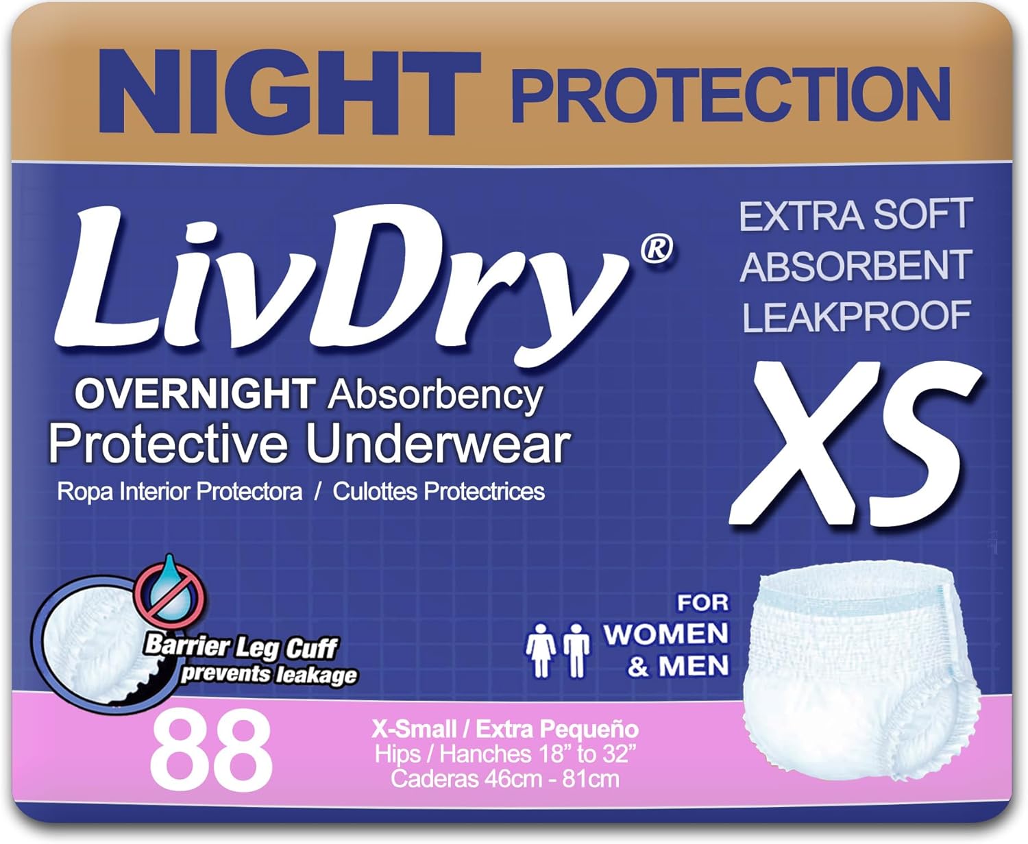 LivDry Adult XS Incontinence Underwear, Overnight Comfort Absorbency, Leak Protection, X-Small, 88-Pack