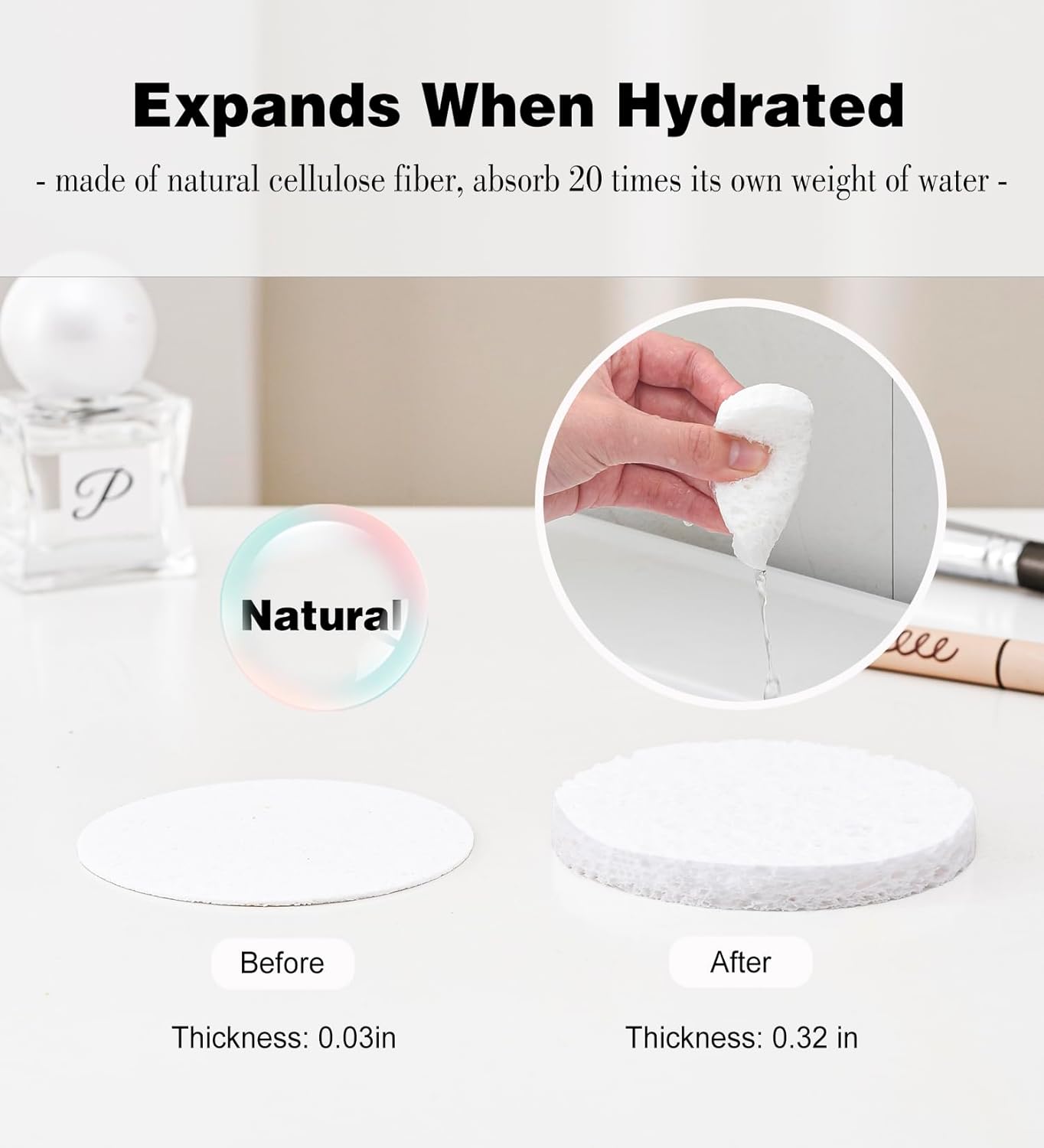 - 【Package & Size】: 50-count little round cellulose facial sponges. 2.8" dia. x 0.32" thick after hydrated