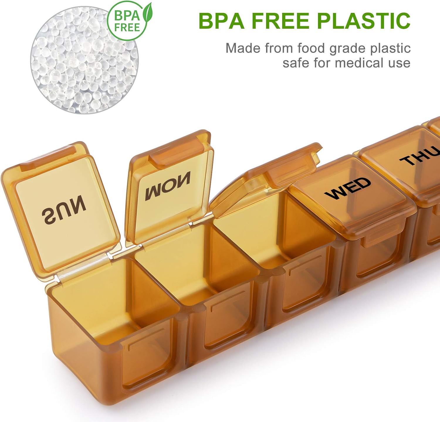 - Easy-to-Read Pill Case - The uppercase bold and wear-resistant day labels on the pill cases organizers 7 day make distinguishing the days of the week effortless. BUG HULL pills organizer is made of food grade BPA-Free material, safe for medical use.