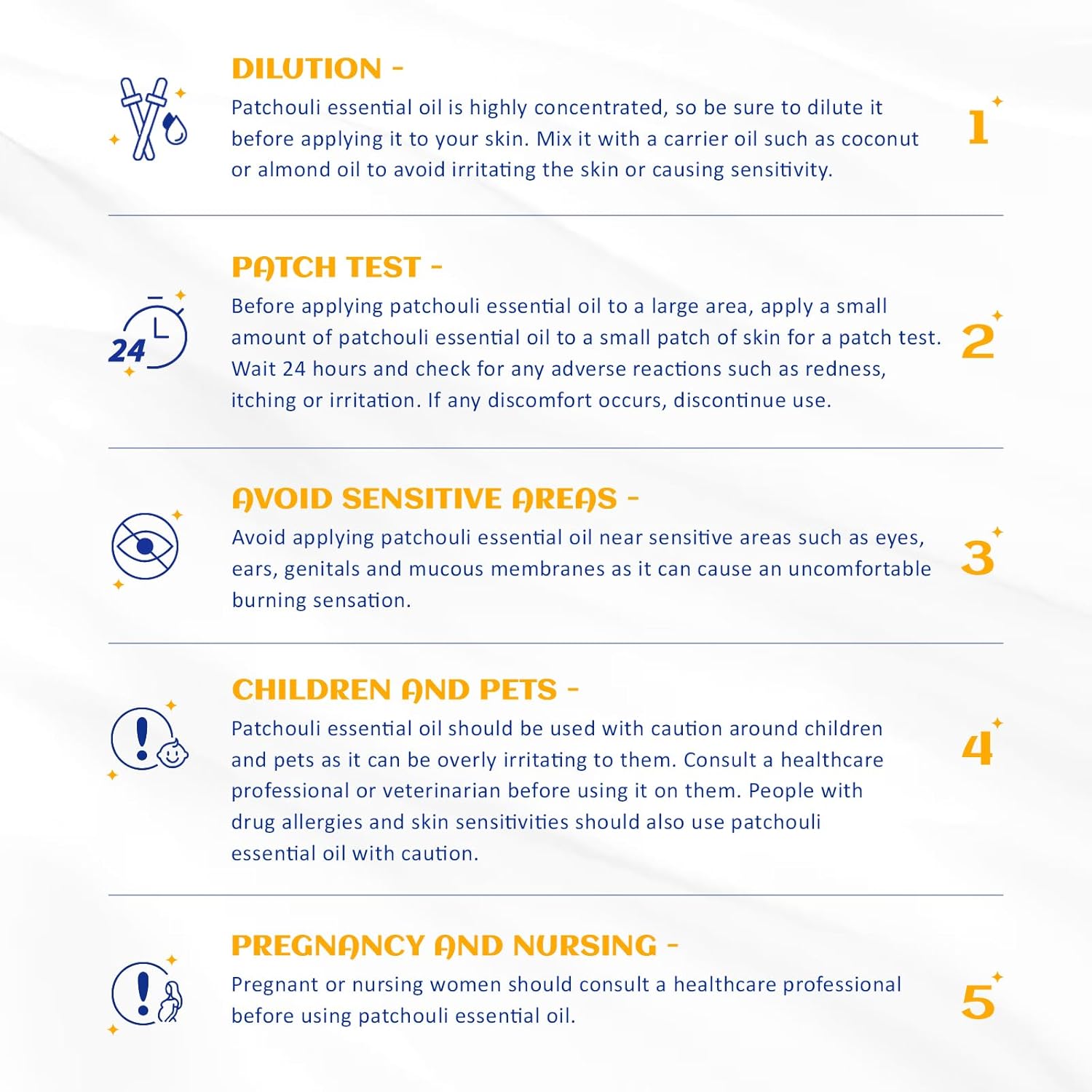 - Multiple Blend: Patchouli essential oil can be blended with Juniper Berry, Bergamot, Black Pepper, Ginger, Sage, Rose, Myrrh, Lemongrass, Frankincense, Pine, Sandalwood, Geranium, Lavender, Ylang-Ylang essential oils. Dilute with carrier oil before use. Test on feet first for skin sensitivity prior to widespread use