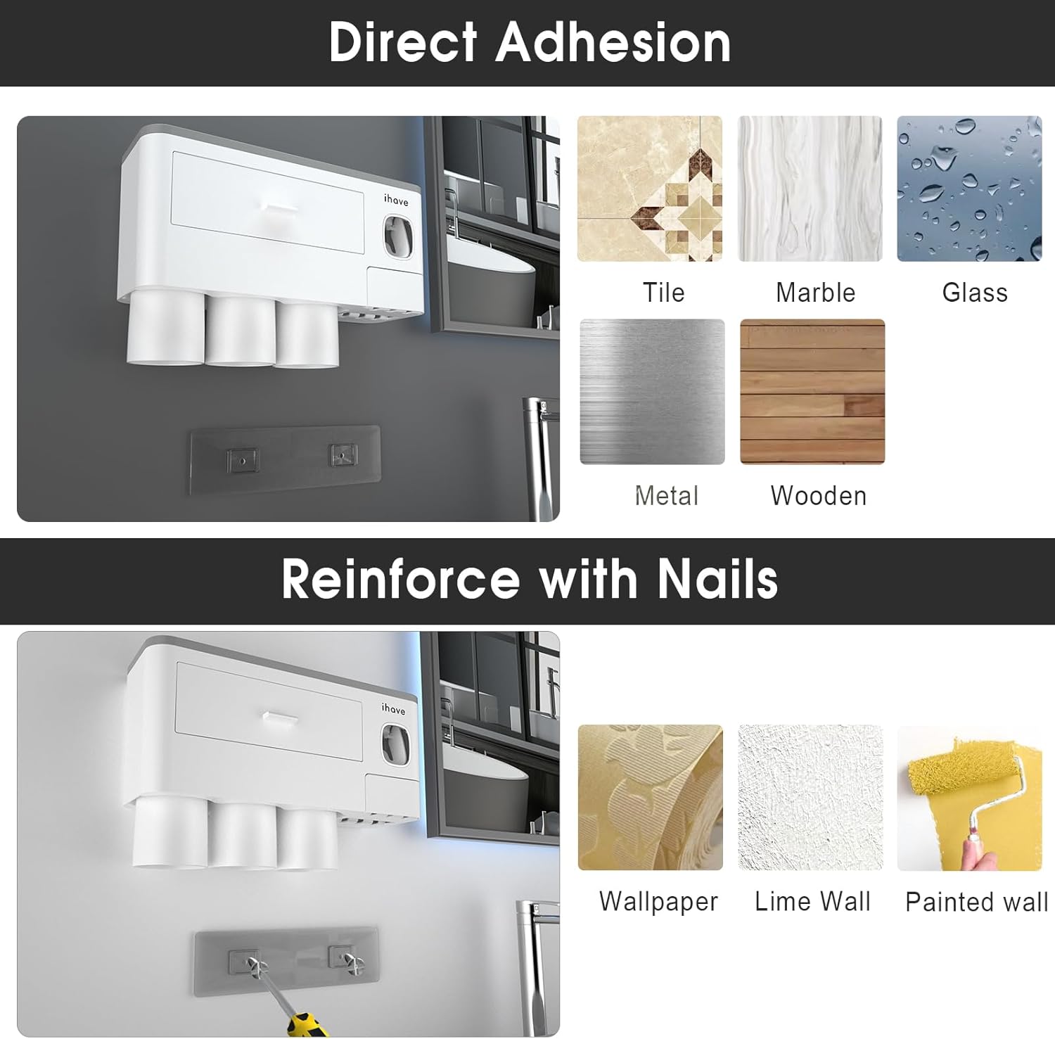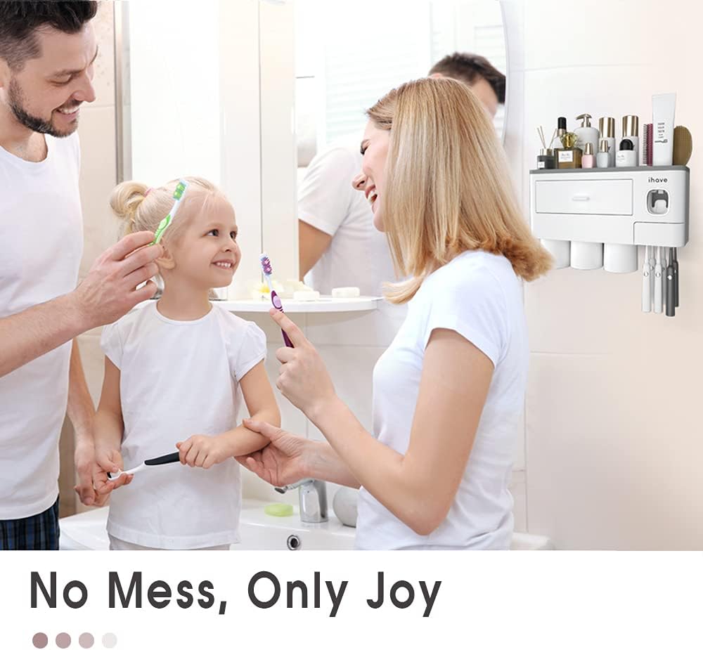 - Easy to Use: Our multi-function toothbrush holder wall mounted features an automatic toothpaste dispenser to squeezes toothpaste effortlessly without any waste.The 3 magnetic mouthwash cups are with inverted drainage design to prevent dust and water stain. It can hold up to 6 toothbrushes at the same time, perfect for the whole family.