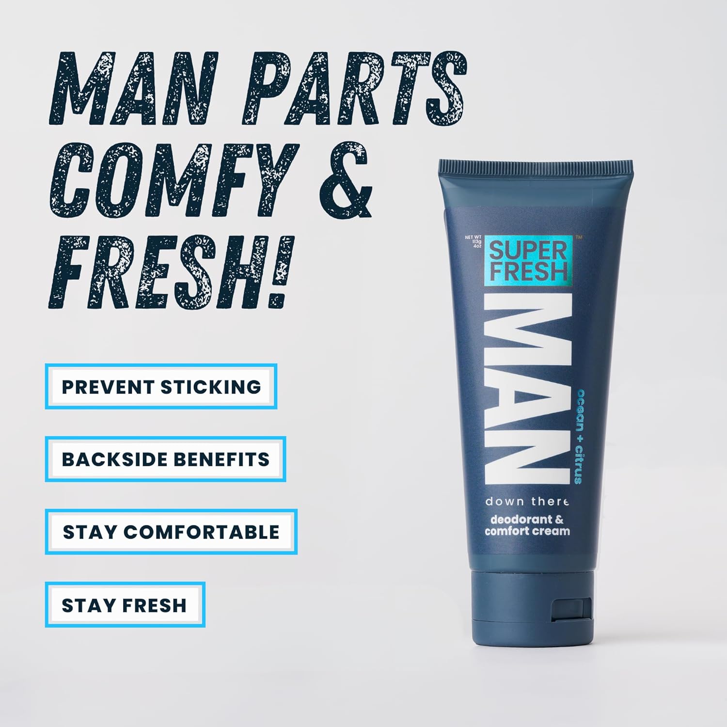 - PREVENT SWAMPY STICKY SMELLY MAN PARTS: Take control of daily discomfort caused by heat, humidity, and sweat with this moisturizing hygiene lotion designed specifically for menâs groin, balls, and buttocks. Super Fresh delivers targeted freshness by stopping stickiness and odor before it starts, so you stay dry, confident, and irritation-free whether you're working, exercising, or just getting through a hot day.