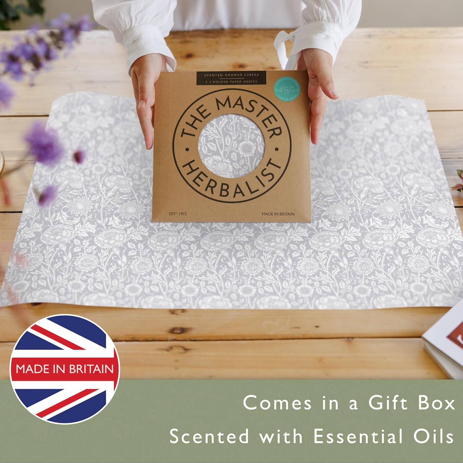 - NEW & IMPROVED FRAGRANCE Formulations: LILY OF THE VALLEY Scented Drawer Liners with Essential Oils in a GREY William Morris Design. Gift Box of 5 large paper sheets (FOLDED) Vegan Friendly, Allergen Free. Made in the UK