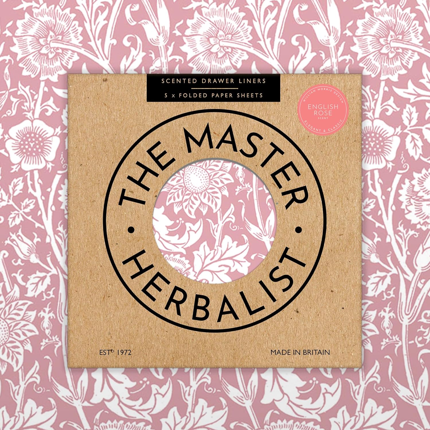 Rose Scented Drawer Liners in a Pink William Morris Design. Contains Rose Essential Oil | Pack of 5 Folded Sheets | Contains Essential Oils | Made in The UK.