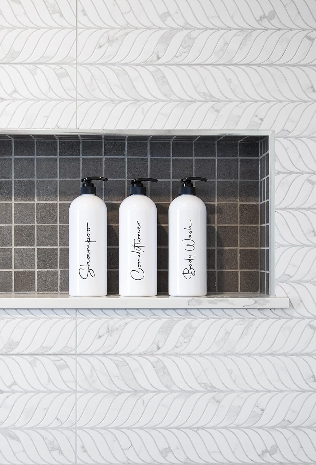 - LUXURIOUS HIGH-END STYLE APPEAL - A luxurious high-end look offsets your bathroom beautifully with elegant black script on a clean white background. Gorgeous silkscreened labels are permanent and peel-proof. Go from cramped and cluttered to soothing and spa-like.