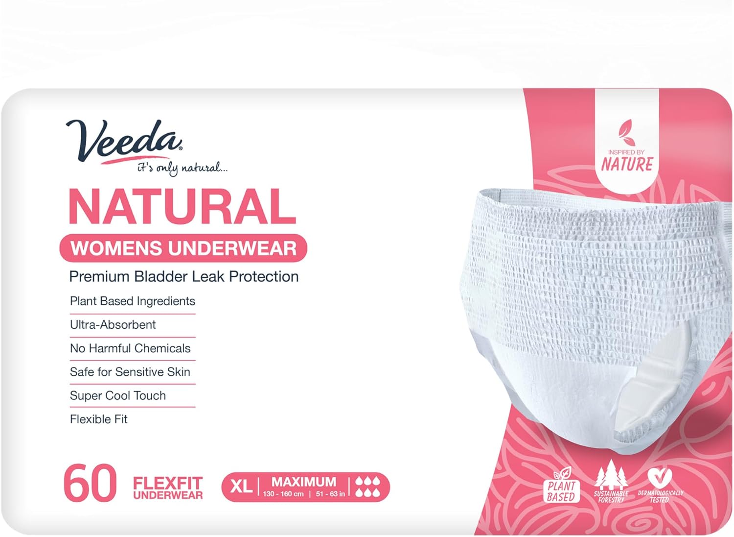 Veeda Natural Adult Incontinence Underwear for Women - Postpartum Underwear for Bladder Leakage Protection - Disposable Underwear with Maximum Absorbency - X-Large Size - 60 Count