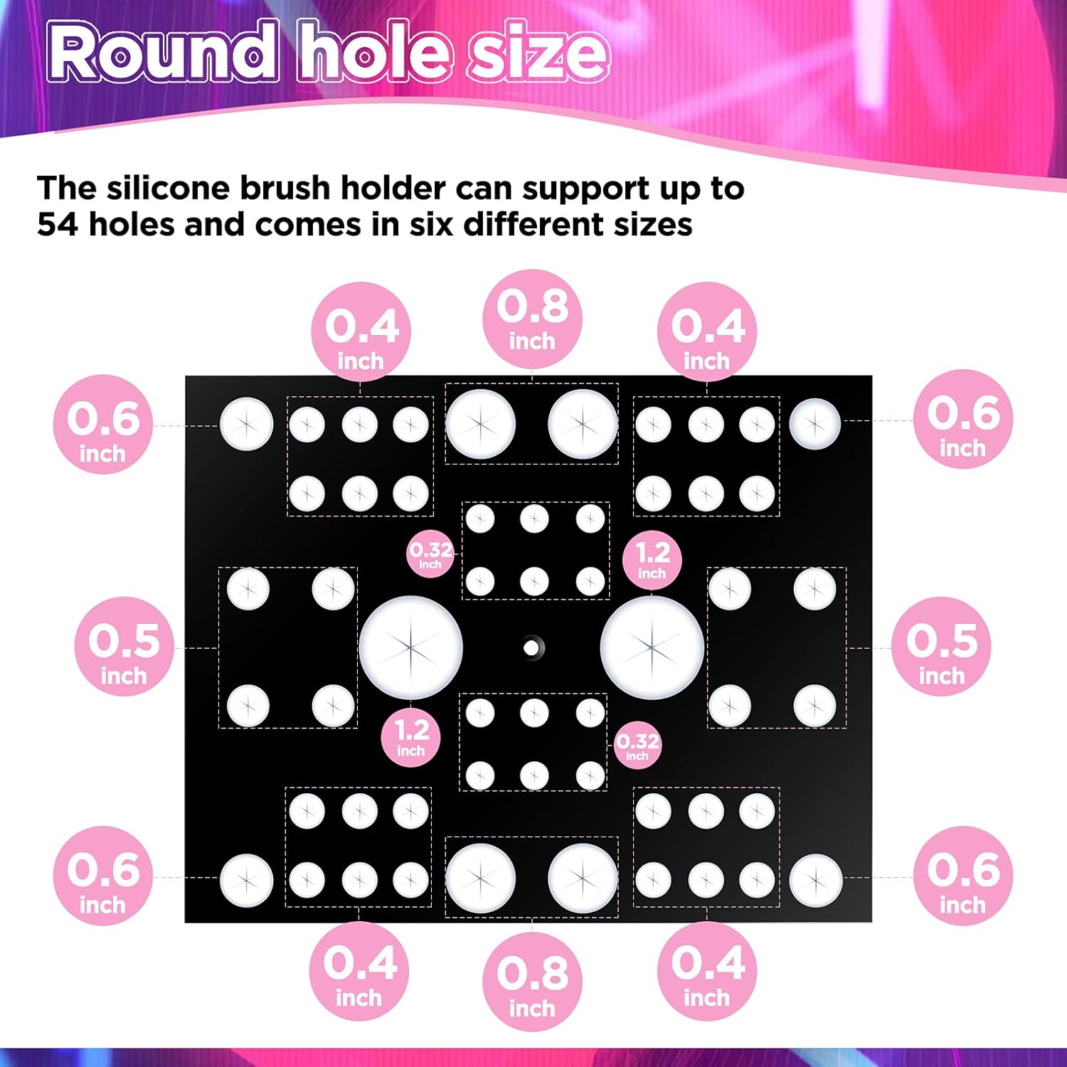 - Size information: our collapsible makeup brush holder measures approx. 7.8 x 6.3 inches with 6 holes of different sizes, including 0.3 inches, 0.4 inches, 0.5 inches, 0.6 inches, 0.8 inches, and 1.2 inches, which can meet brush requirements of most kinds of sizes