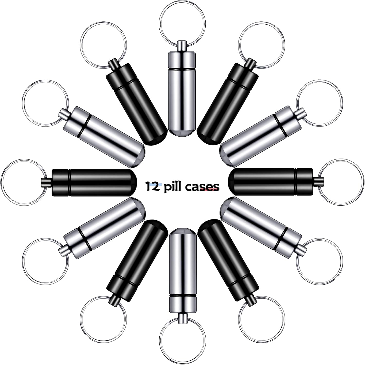 Patelai 12 Pcs Portable Keychain Pill Holder Mini Pocket Pill Case for Men Women Aluminum Geocache Containers Waterproof Metal Medicine Bottle Organizer for Outdoor Camping Travel(Black and Silver)