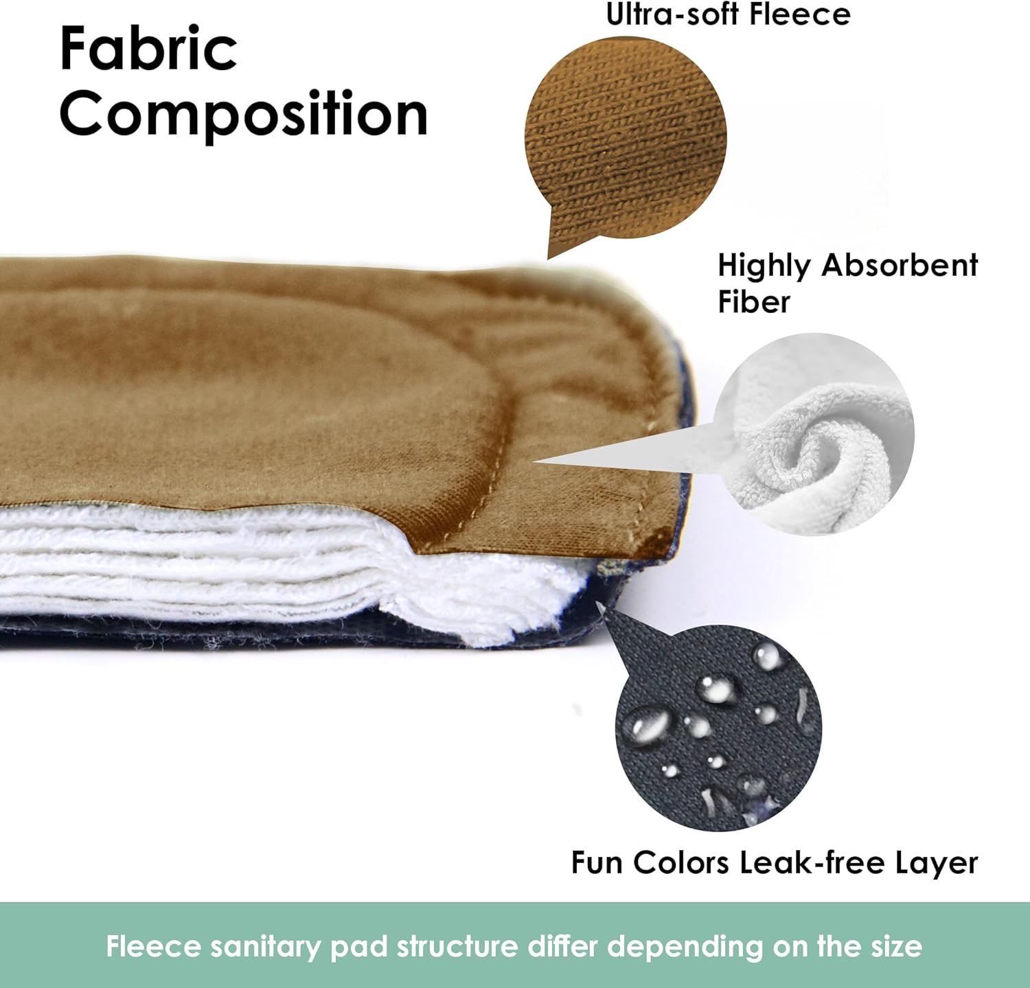 - Breathable Layer: Cloth panty liners structure differ depending on the size. Menstrual cloth pads Inner layer is ultra-soft fleece which lays against your skin, moistures wicking, and neutralizes odor. Lining layer is super-absorbent, different sizes the layers are different. Outshell layer is leak-free TPU with backside silicon dot. The soft and gentle reusable sanitary pads offer great coverage and absorbency to keep you from any leaks and spills