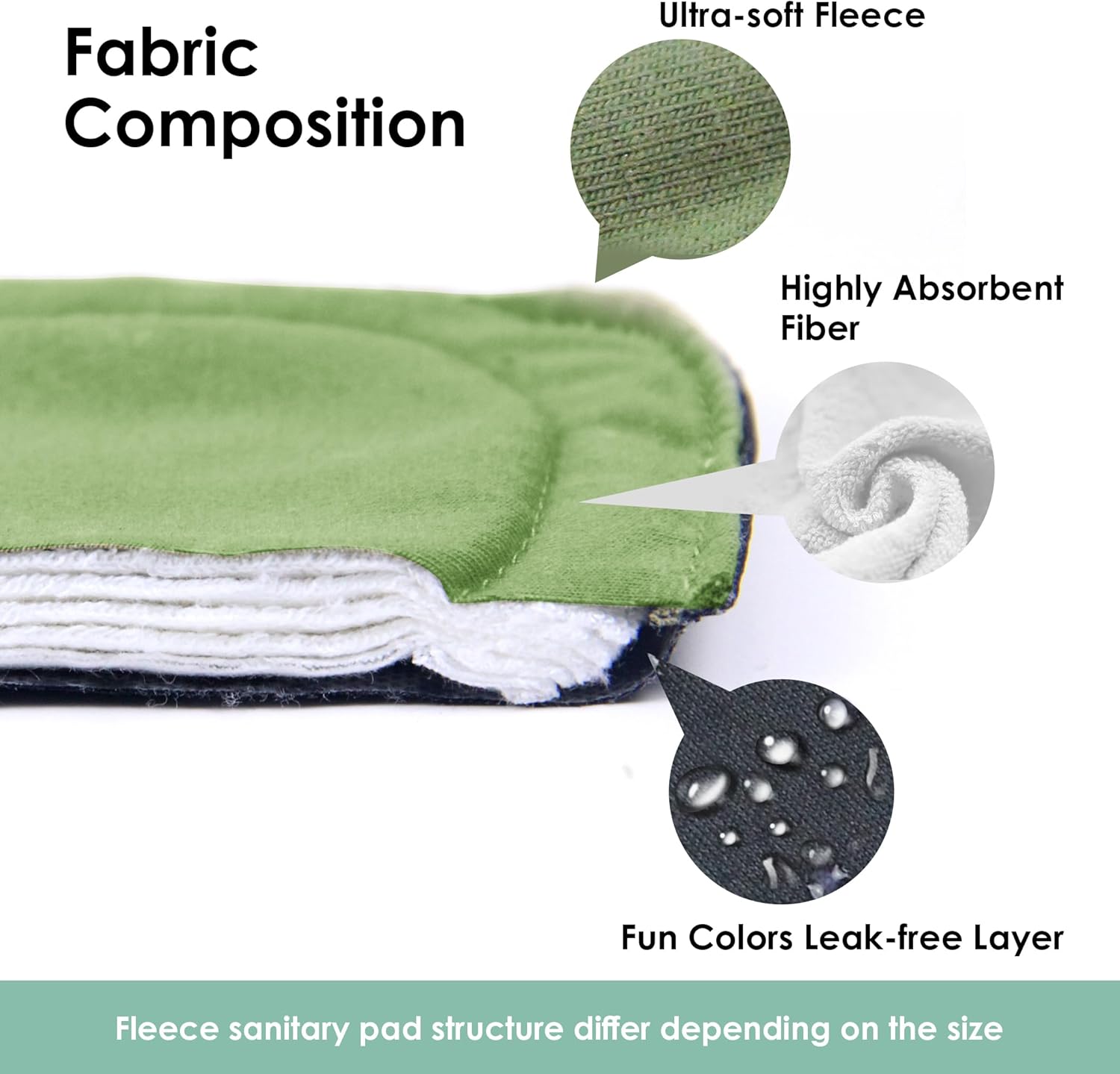 - Breathable Layer: Cloth panty liners structure differ depending on the size. Menstrual cloth pads Inner layer is ultra-soft fleece which lays against your skin, moistures wicking, and neutralizes odor. Lining layer is super-absorbent, and different sizes the layers are different. Outshell layer is leak-free TPU with backside silicon dot. The soft and gentle reusable sanitary pads offer great coverage and absorbency to keep you from leaks and spills