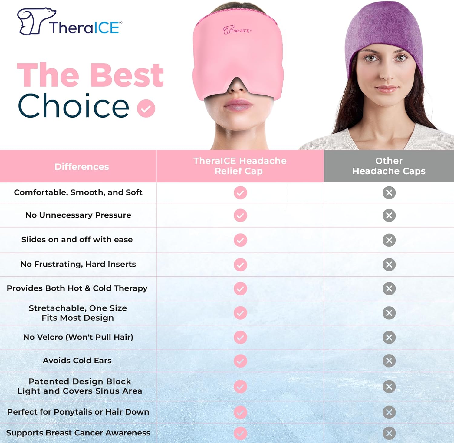 - ULTIMATE COMFORT & MIGRAINE RELIEF: Experience the soothing comfort of TheraICE Headache Hat migraine relief cap for women, designed to fit all face shapes, head sizes, and eye contours. Whether you're dealing with migraines, tension headaches, sinus headaches, or pregnancy headache relief gift for mom, this cold migraine relief cap for women or cooling migraine mask provides targeted relief. It’s your go-to migraine cap and headache relief mask for fast, effective migraine relief products.