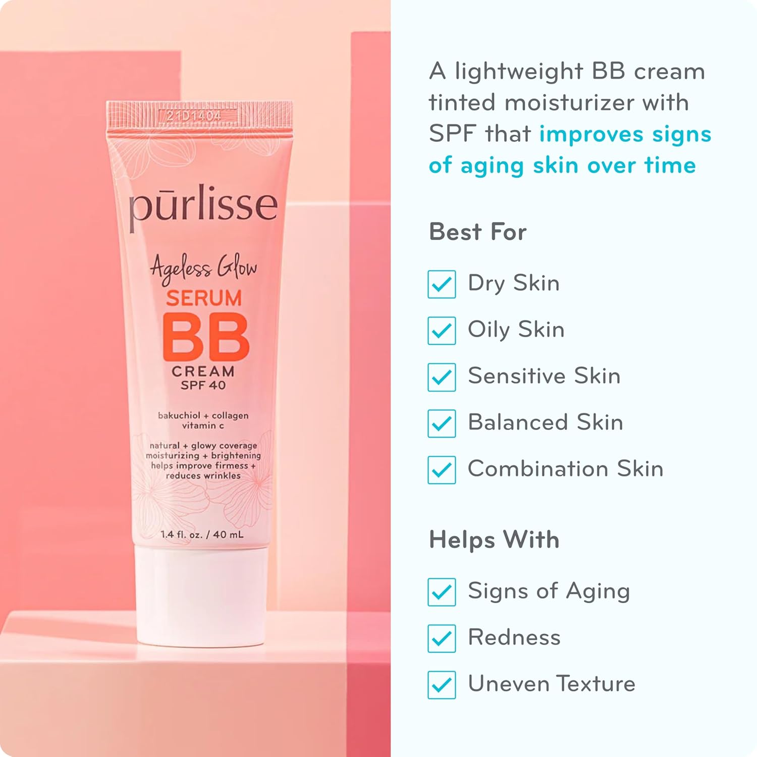 pūrlisse Ageless Glow Serum BB Cream SPF 40 - Glow BB Cream with SPF Enriched with Bakuchiol & Vitamin C to Help Improve Firmness & Reduce Wrinkles for Dewy Skin - Medium Warm (1.4 oz)
