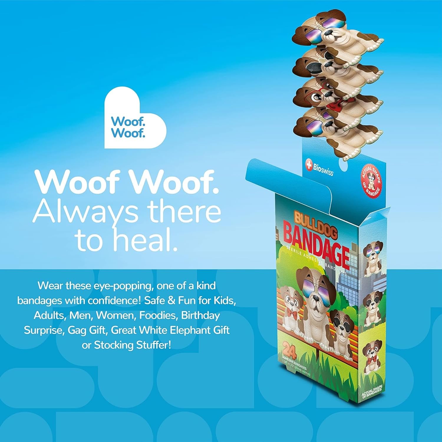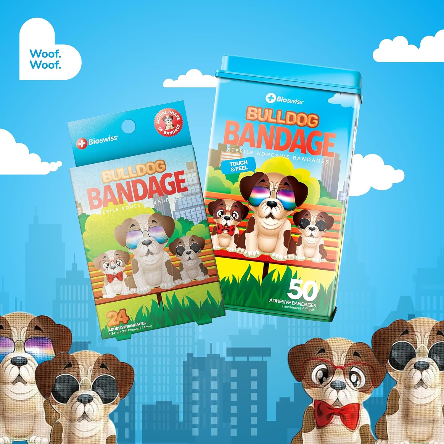 - 24 BULLDOG KIDS BANDAGES: Fun dog-shaped adhesive bandages pack helps protect cuts, scrapes, and minor wounds while making healing less stressful for children; bandages come in 3 assorted styles