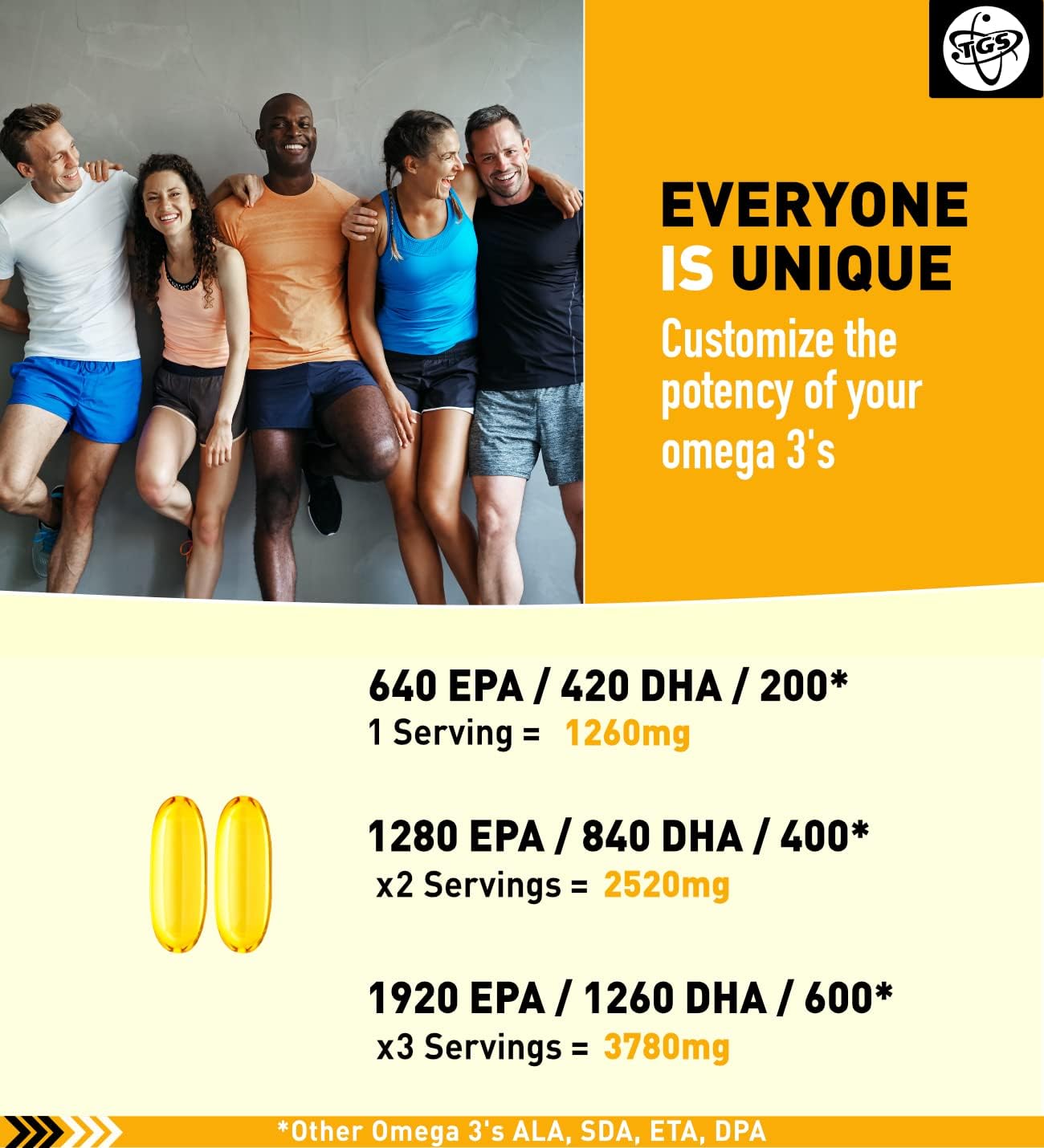 - TRIPLE STRENGTH, ULTIMATE EPA & DHA BALANCE: Our omega 3 supplement has 1260 mg of omega 3’s per serving with 640 mg EPA, 420 mg DHA & 200 mg of other essential omega 3’s; No omega 6 fillers. Need extra strength, 2000mg plus? Double the dose and take 2 servings for 2520 mg or triple dose with 3 servings for 3780 mg of pure omega 3’s; Customize your daily dose
