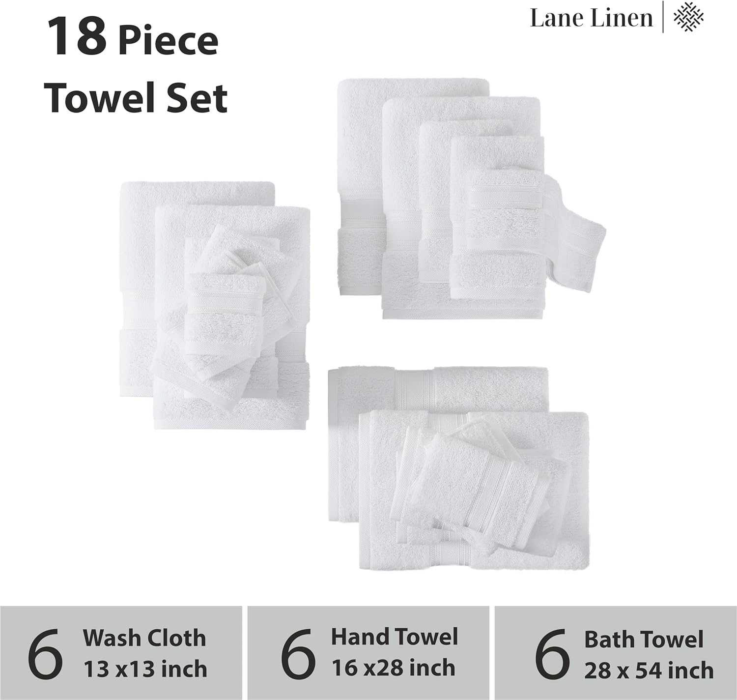 LANE LINEN 100% Mercerized Cotton Luxury Bathroom Towel Set - 18 Pcs - Super Soft, Fluffy & Highly Absorbent - 6 Bath Towels, 6 Washcloths, 6 Hand Towels - Complete Family Pack - White Bath Towel Set
