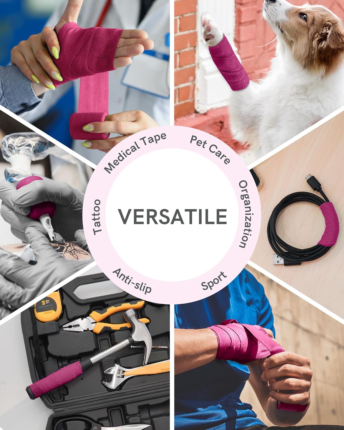 FriCARE Self Adhesive Bandage Wrap, Medical Tape in First Aid Kit, Cohesive Bandages for Wounds Sport Vet, 2 Inches X 5 Yards 6 Rolls, Magenta