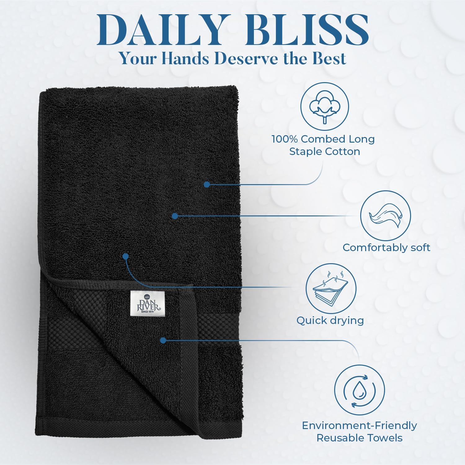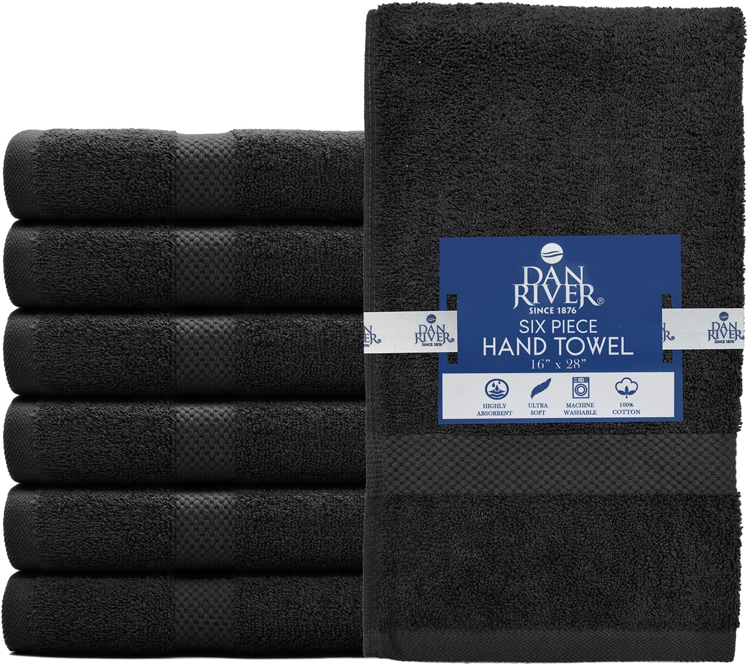 DAN RIVER 6-Pack Premium Hand Towels (16x28 Inches) - 100% Cotton, Ultra Soft, Lightweight, Highly Absorbent Towels for Bathroom, Spa, Gym, Salon, Hotel, and Travel - 550 GSM โ Black