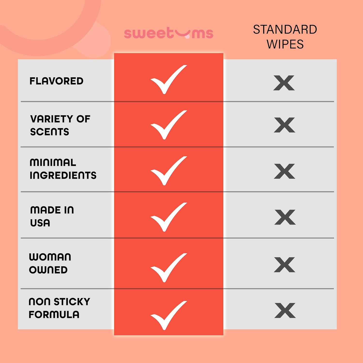- DELICIOUS & REFRESHING - Sweetums flavored wipes are the only female wipes that helps with both personal hygiene, and has a natural flavor that tastes and smells great!