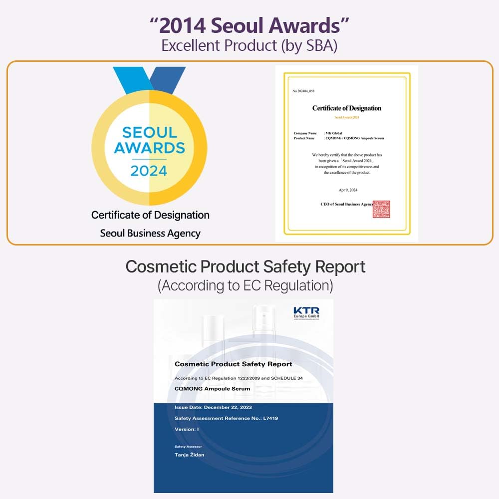 - [Safety] Safe to use on sensitive skin. Not including animal, harmful ingredients (Paraben, Formaldehyde, Sulfate, Oil, Surfactants, Artifical Fragrance & Color, Cruelty Free). * Produced by the largest cosmetics manufacturer(With ISO & CGMP Certification) in Korea. * Completed MoCRA Registration. * Cosmetic Product Safety Report according to EC Regulation (Safety Assessment Reference No. : L7419) * “2024 Seoul Awards” : Excellent Product (by SBA in Korea)