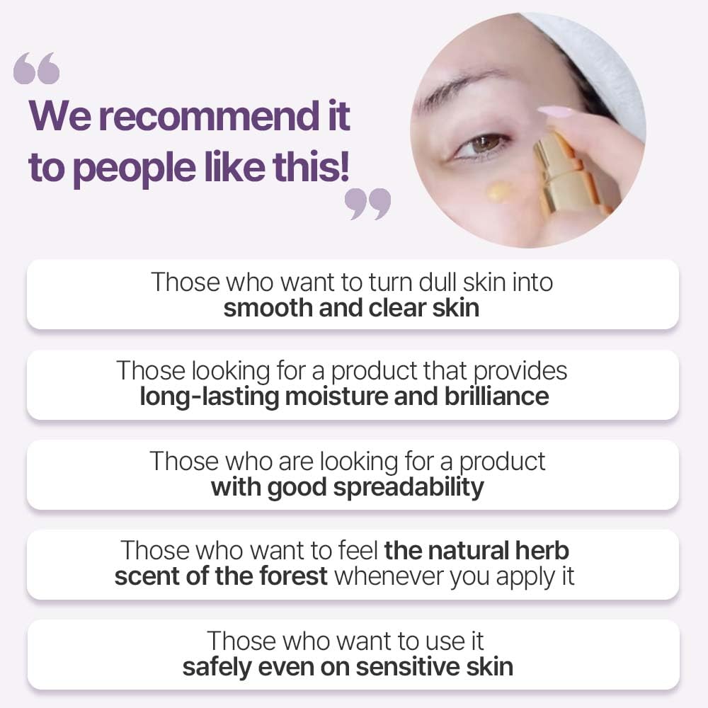- [Another Benefits / Features] It makes the skin glowy right after applying it. Not only moisturizes the inside & outside but also keeps moisture with the Triple combination of Polymer, Medium and Small Molecules. Long persistence of moisture & brilliance, soft application. Turning dull skin into smooth and clear skin. * Natural Herb Scent, Natural Color of Plant extracts (No ! artificial scent & color) → Good for Healing!