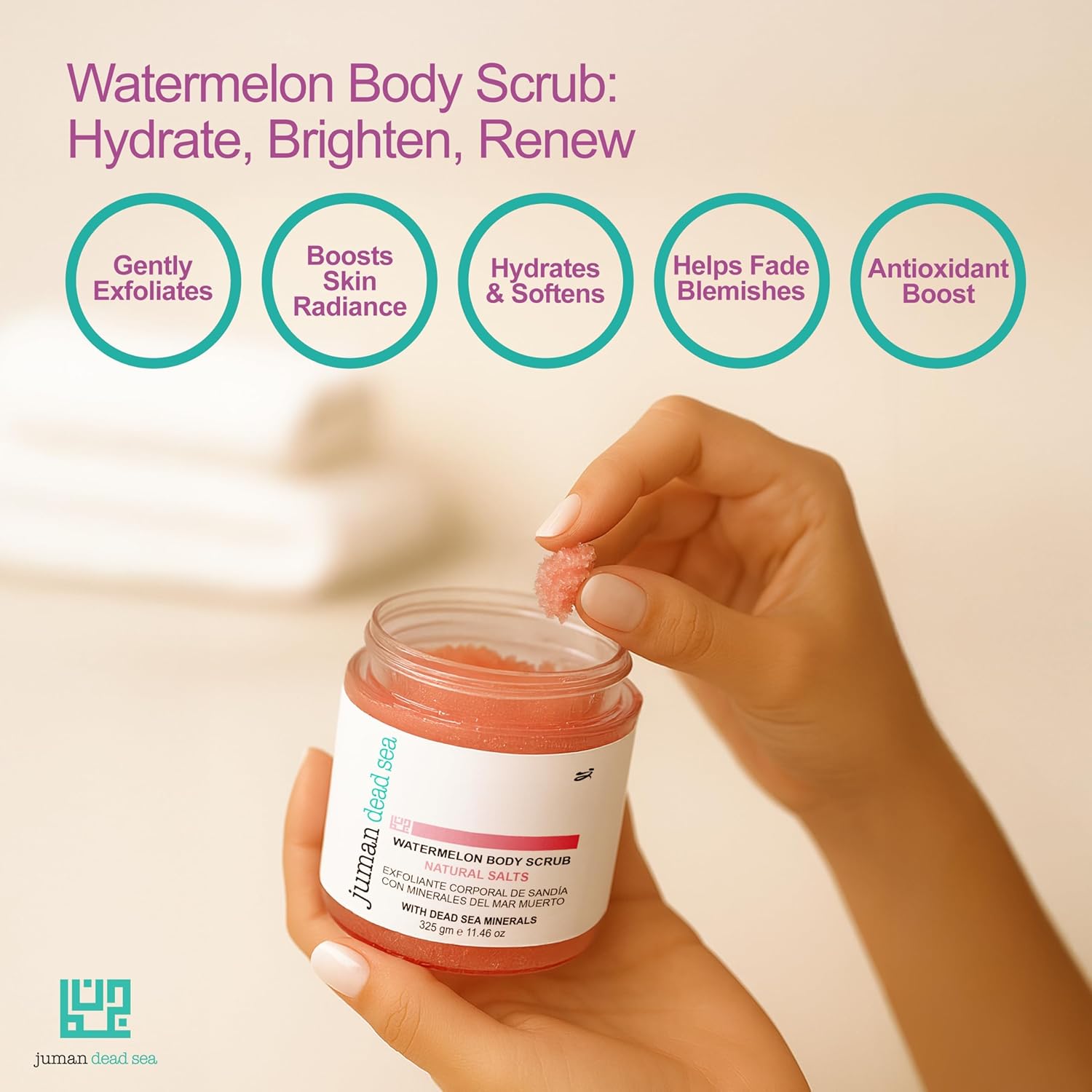 Juman Dead Sea Minerals Watermelon Body Scrub | Infused with Shea and Cocoa Butter | Removes Dead Skin Cells and Rejuvenate Dull Skin | SlS & Paraben Free | Vegan | 11.46 Oz