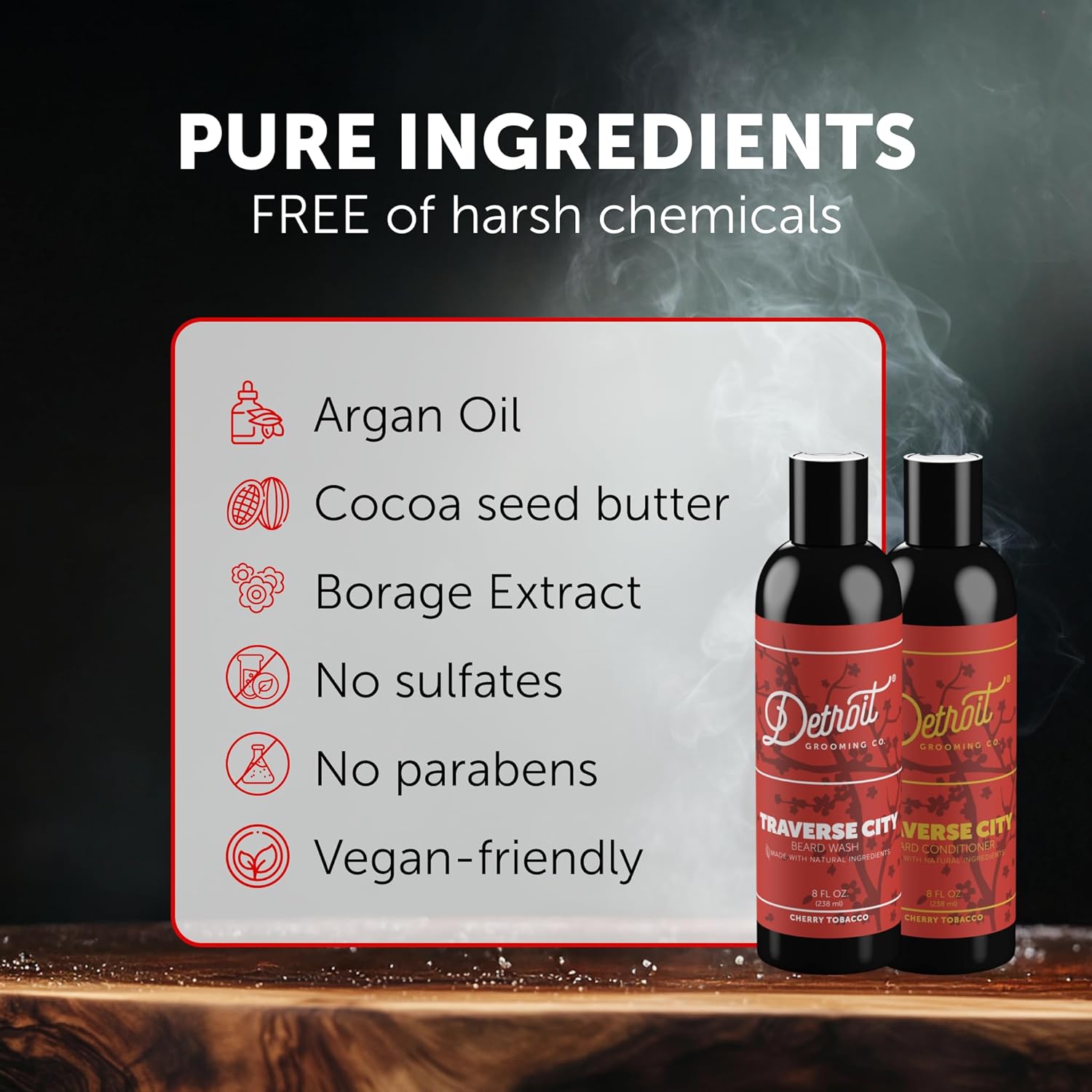 Detroit. Grooming Co. Beard Wash and Beard Conditioner - Men's Kit - Softens,Strengthens,Moisturize - Biotin-Infused w/Argan Oil, Apple Extract, Aloe Vera - Cherry Tobacco Scent - Traverse City - 8oz