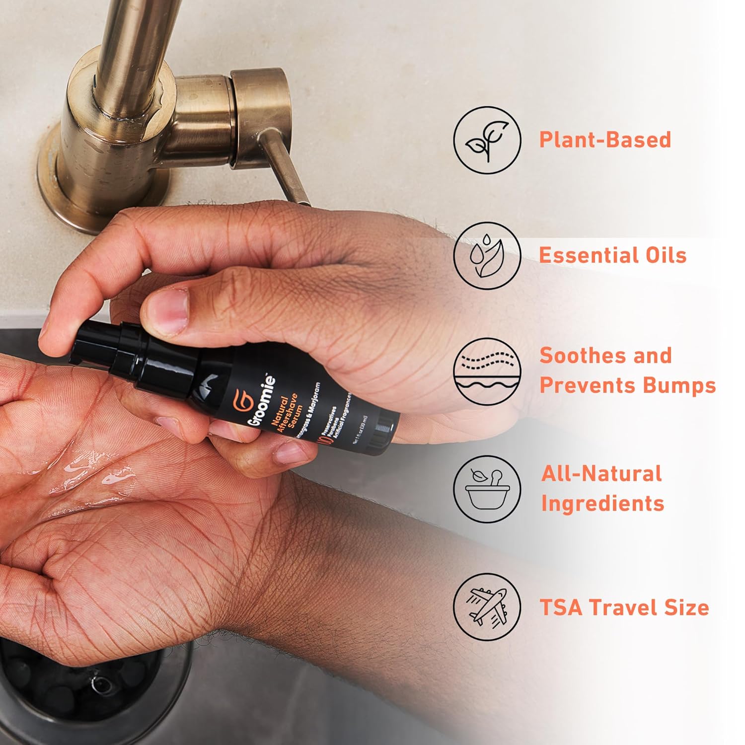- Part of A Complete Shaving Set: Our Natural mens aftershave is part of the Groomie line of men's shaving & hair removal products that are designed to give you a close shave while leaving your skin smooth and refreshed. This aftershave liquid for men and women helps prevent razor bumps and burn, no matter if you're using a classic cartridge blade or an electric razor or trimmer.