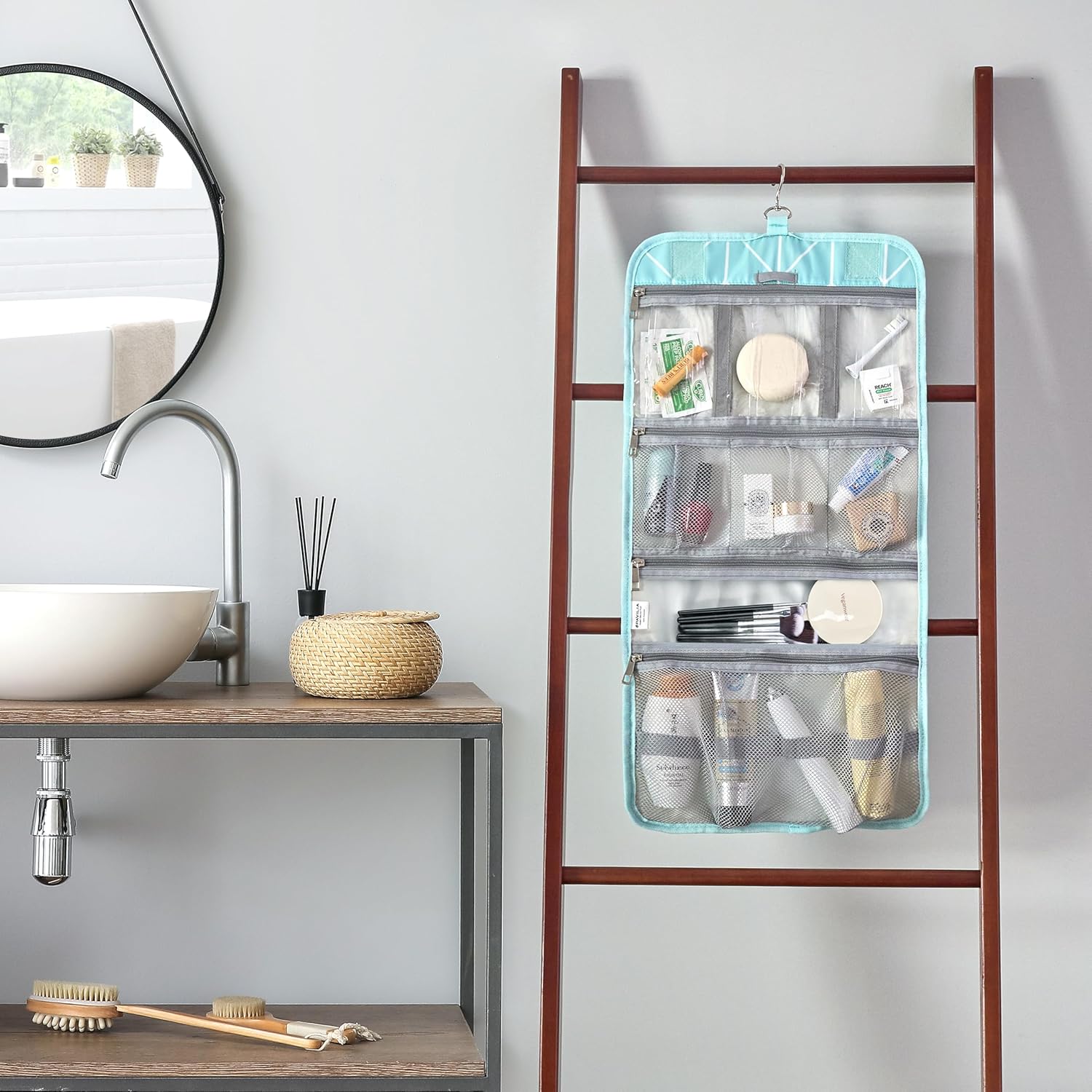 - WATER-RESISTANT & EASY TO CLEAN: Durable polyester with waterproof sections, just wipe clean. Perfect for storing travel-size shampoo, conditioner, face wash, toothbrushes, and even a full-size hairbrush. Keeps everything dry, tidy, and ready for any trip.