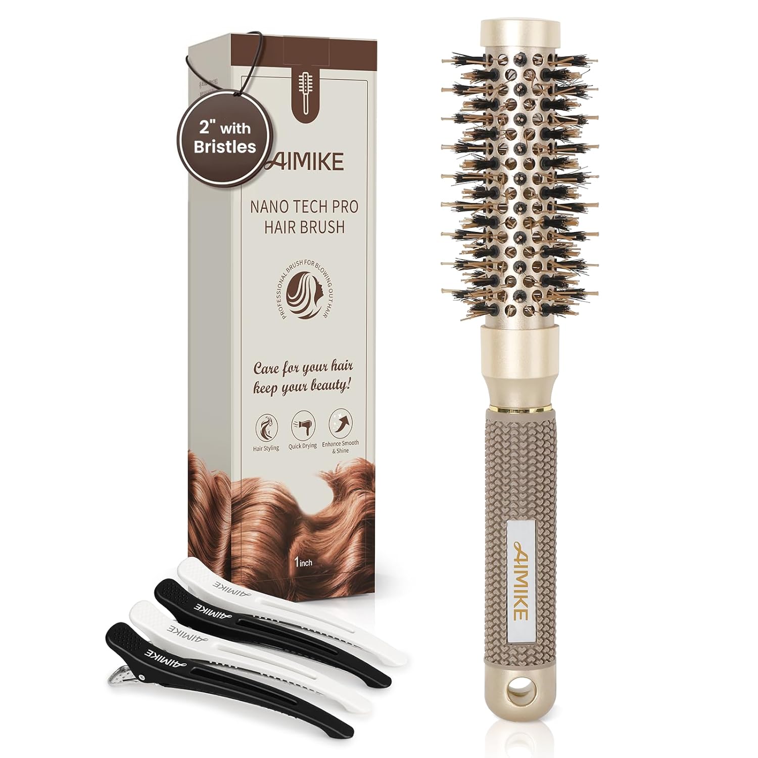 AIMIKE Round Hair Brush, 1 inch Barrel with Boar Bristles, Nano Thermal Ceramic & Ionic Tech, for Blow Drying, Styling, Curling and Shine + 4 Clips (Gold, Unisex, Fine Hair, Short Hair, Anti-Frizz)