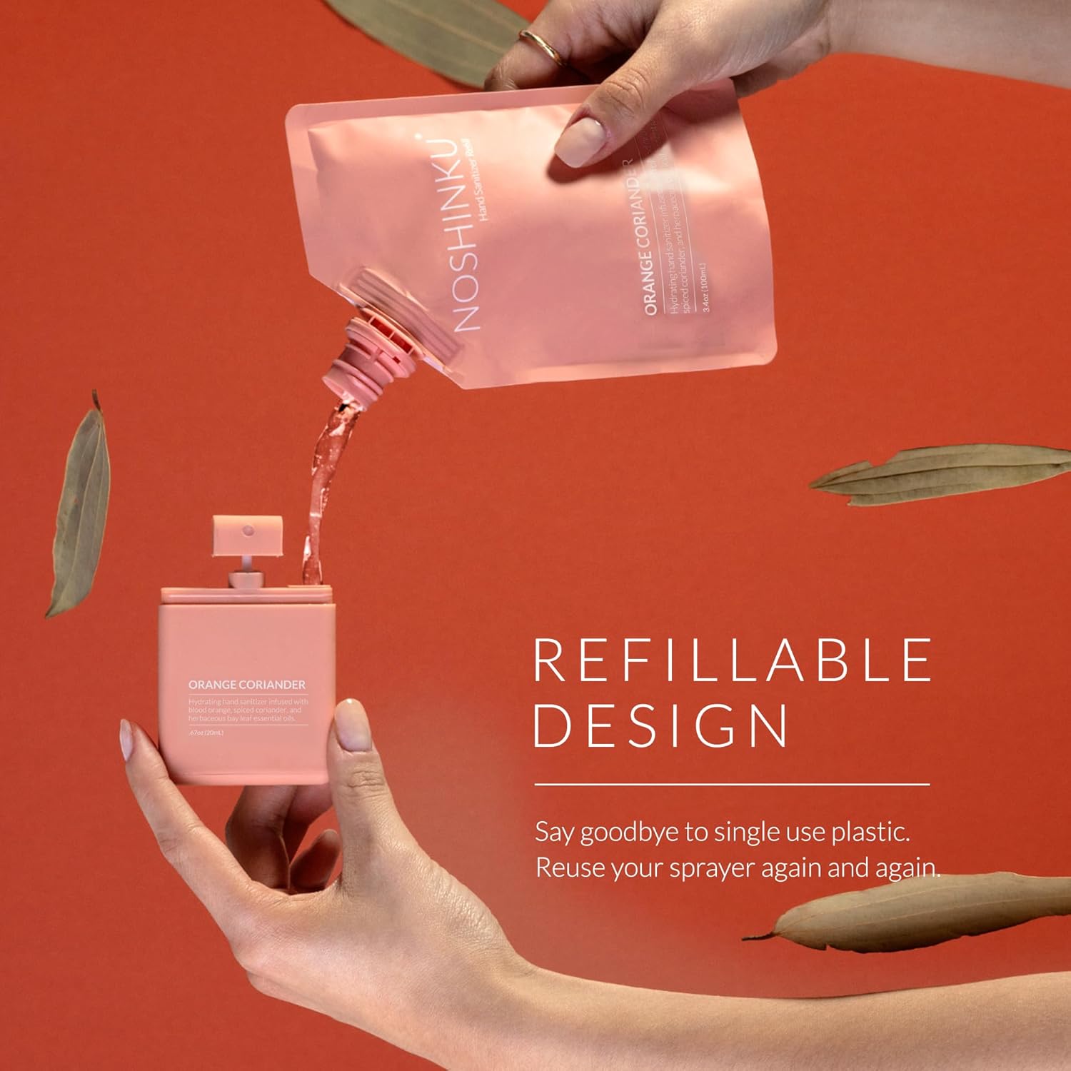 - REFILLABLE POCKET SPRAYERS: Includes 3 refillable pocket hand sanitizer infused with blood orange, spiced coriander, and herbaceous bay leaf essential oils. Each premium soft-touch travel hand sanitizer delivers 300+ sprays and helps reduce plastic waste with our eco-conscious refill system.
