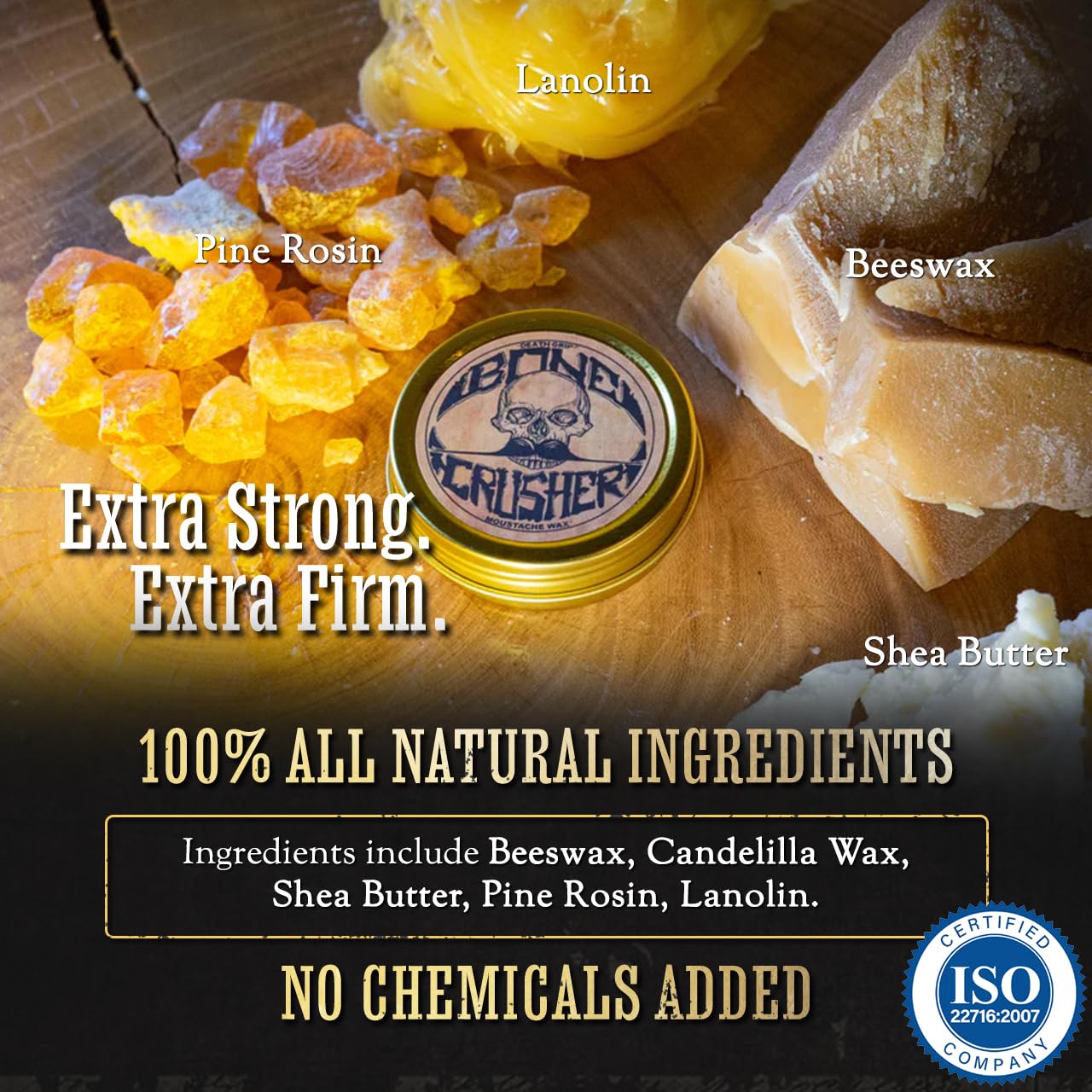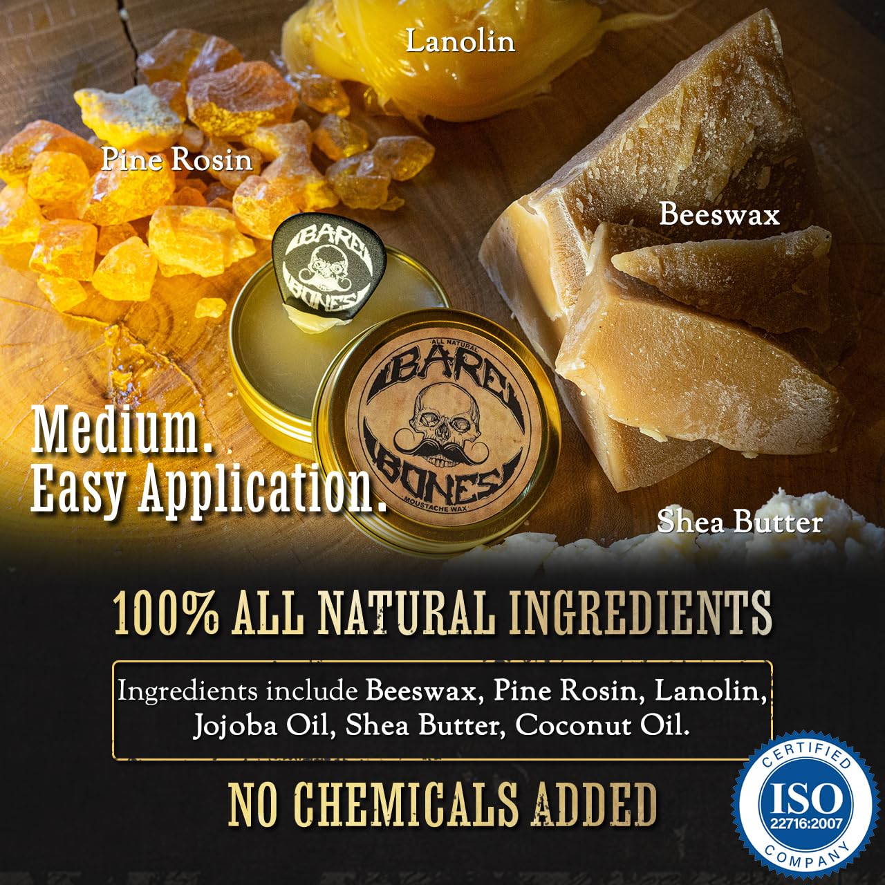 - Award Winning Bare Bones Medium Hold - Our mustache wax has a pliable semi-sticky tacky glue like wax feel that holds those unruly stash whiskers in place for 8+ hours. Unlike other waxes that leave your moustache looking gunky and waxy our waxes preform in a way that gives your mustachio perfect styling and does NOT “pill" up. Perfect for men grooming brown, black, red, grey or white handlebar mustaches