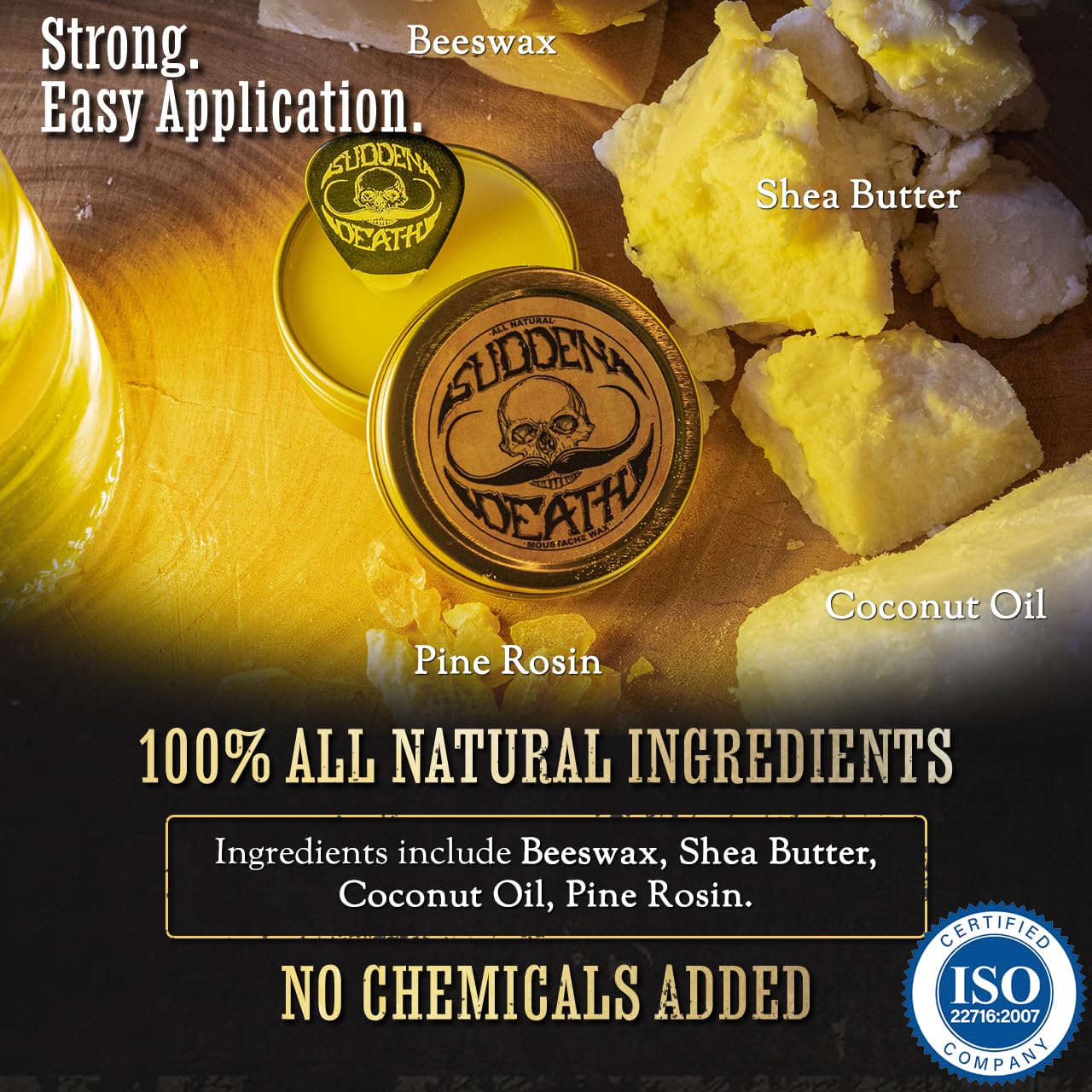 - Sudden Death Award Winning Strong Hold - LONG LASTING - Our mustache wax holds those unruly stash whiskers in place for 8 hours - Our wax will not leave your moustache looking gunky and waxy - Sudden Death mustache wax performs in a way giving your mustash perfect styling and does not pill up - Ideal for men grooming brown black red grey or white stylish mustaches like the handlebar mustache - Moustache Wax strong hold was with a smooth application works well in hot humid cold or windy weather